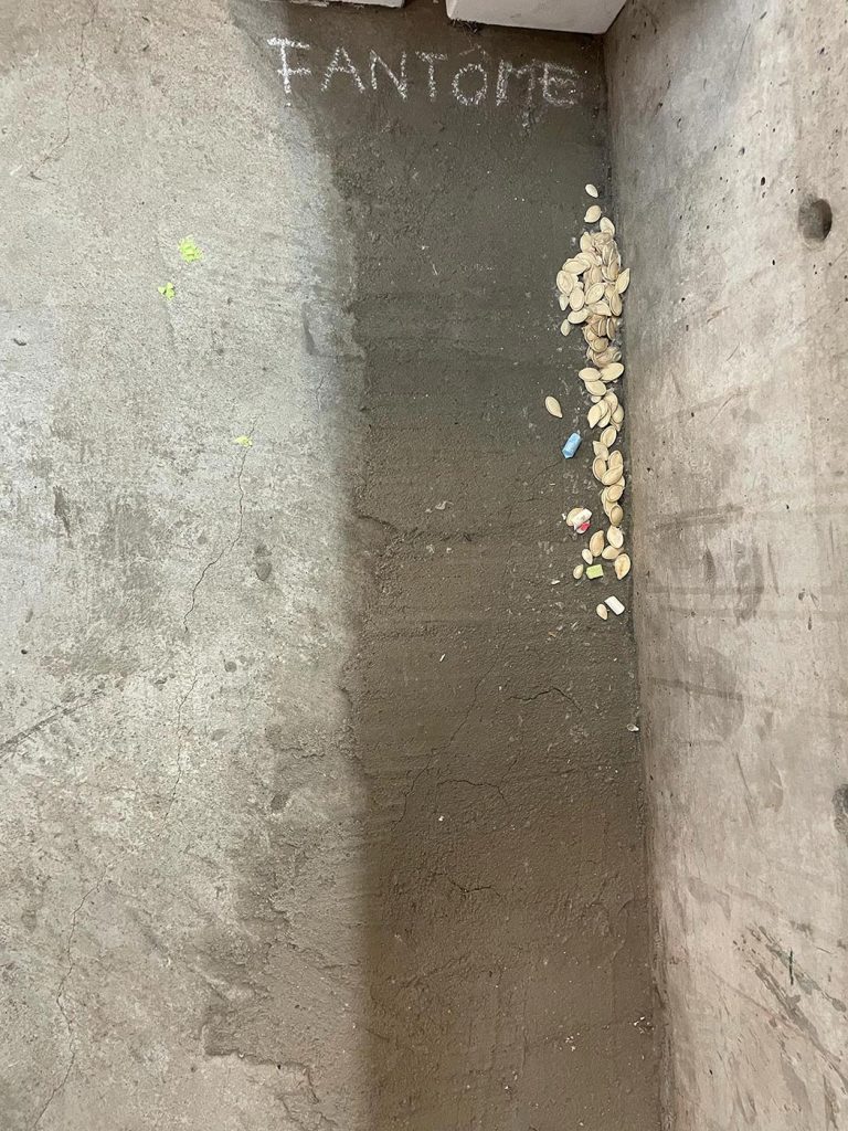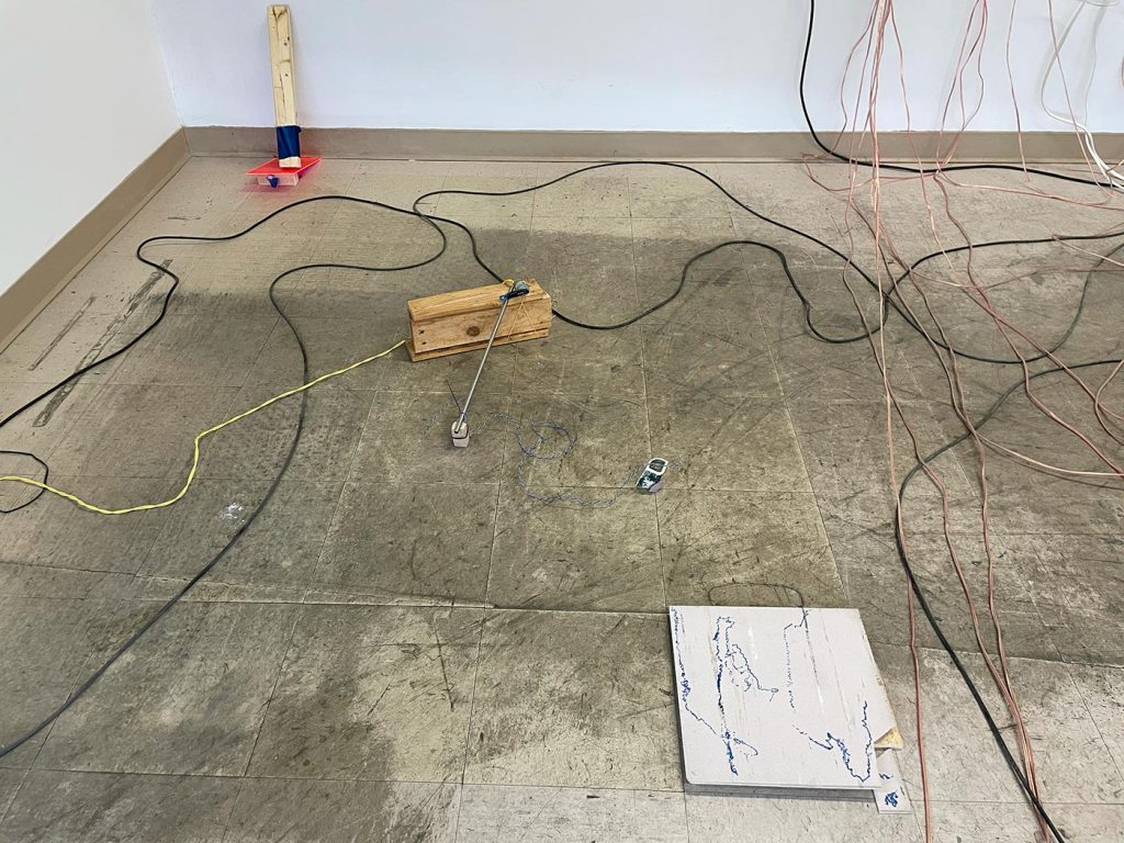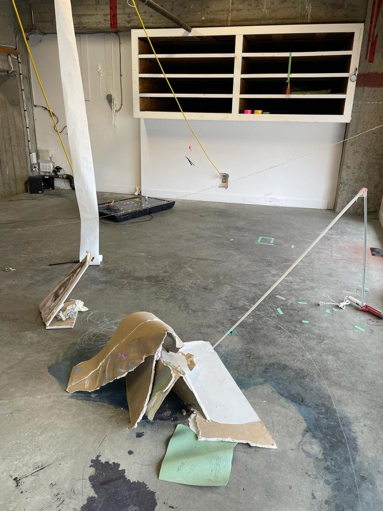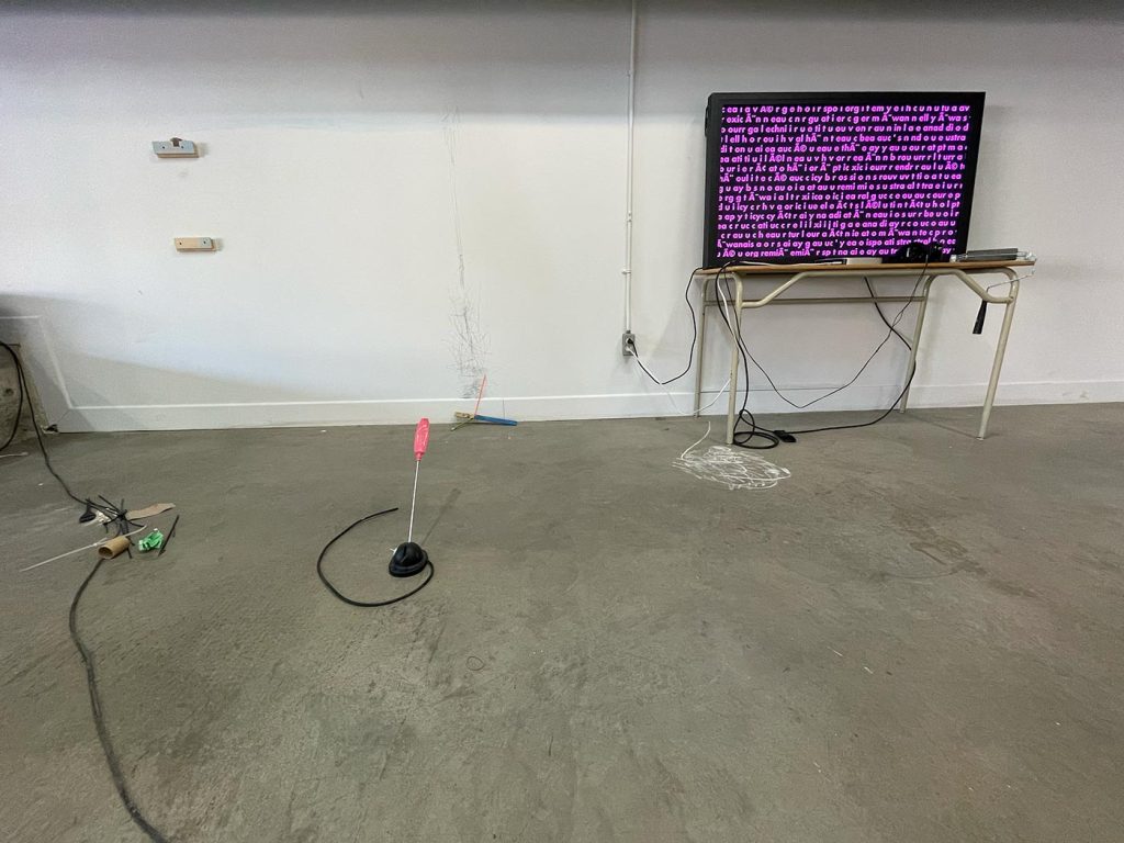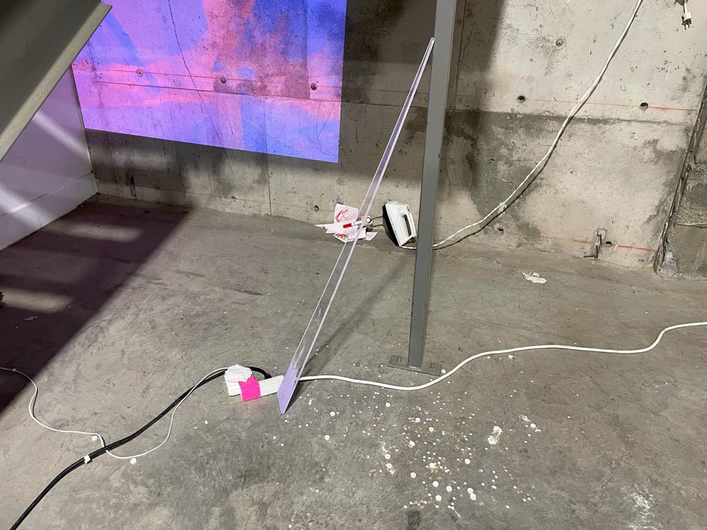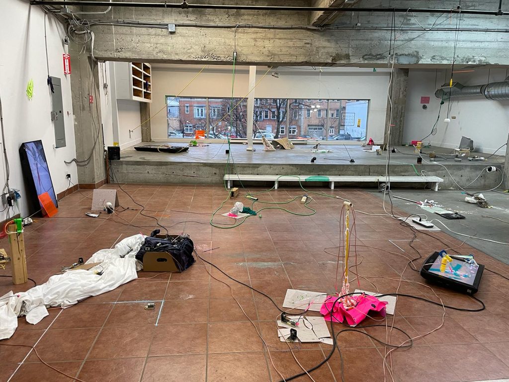 L’improvisation est une méthode centrale dans le cadre du projet Agence Augmentée, et ce, autant dans mes recherches performatives que j’ai réalisées seul à l’été 2022 que dans les expérimentations installatives, sonores et performatives réalisées en collaboration avec Isabelle Lapierre, Katia Martineau, Mathieu P. Lapierre et Vincent Thériault à l’été ainsi qu’à l’automne 2022. Une des tactiques pour organiser les divers matériaux constituant l’installation présentée à la Galerie des arts visuels de l’Université Laval à l’automne 2022 consistait à être attentivement à l’écoute de tout ce qui se trouvait déjà dans l’espace pour que celui-ci puisse être lu comme une partition guidant nos improvisations installatives. En fait, anciennement Les Copies de la Capitale, ce lieu était loin d’être un White Cube, car il était plutôt irrégulier et « bruyant » sur le plan visuel. Ainsi, je demandais à mes collaboratrices et collaborateurs d’être à l’écoute de toutes ses taches et irrégularités afin que les objets que nous déposions dans l’espace interagissent avec celles-ci et que toutes les entités dans l’espace d’exposition deviennent interdépendantes.