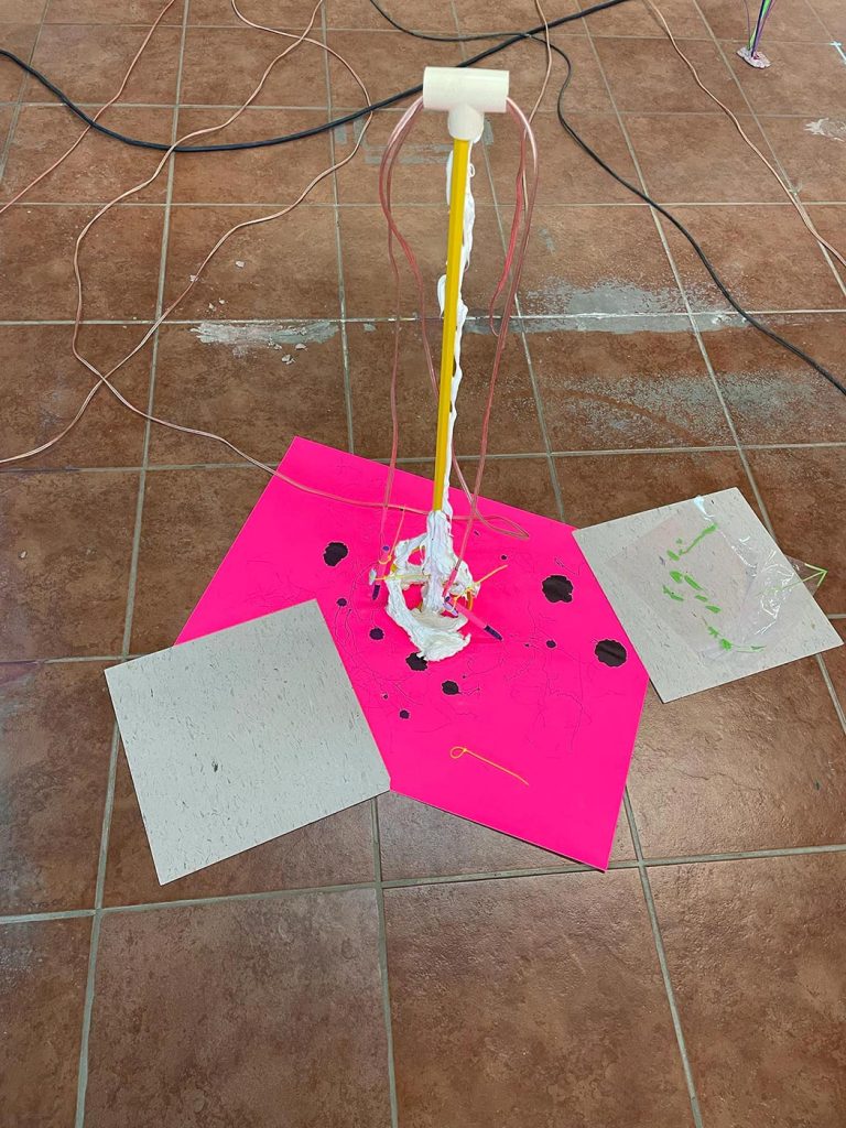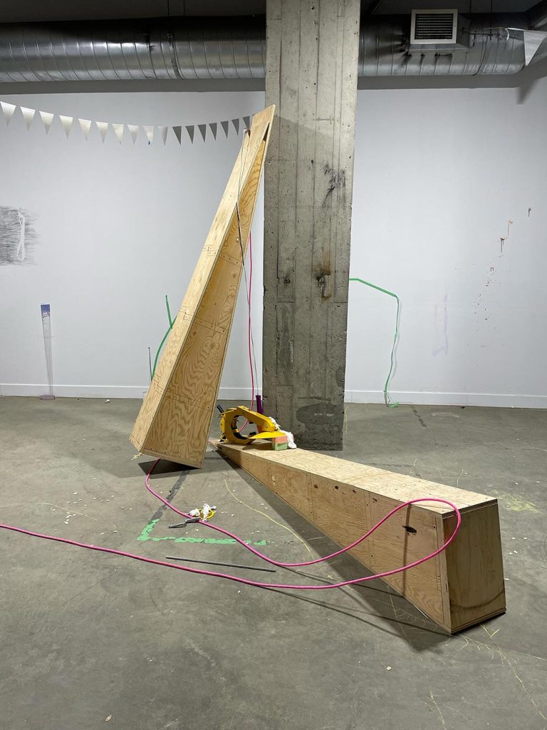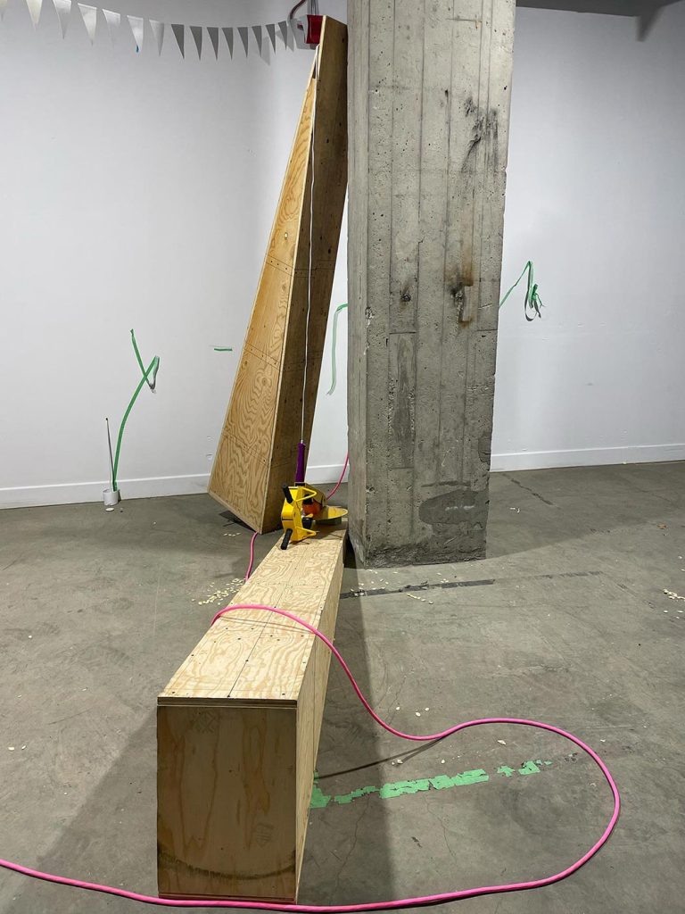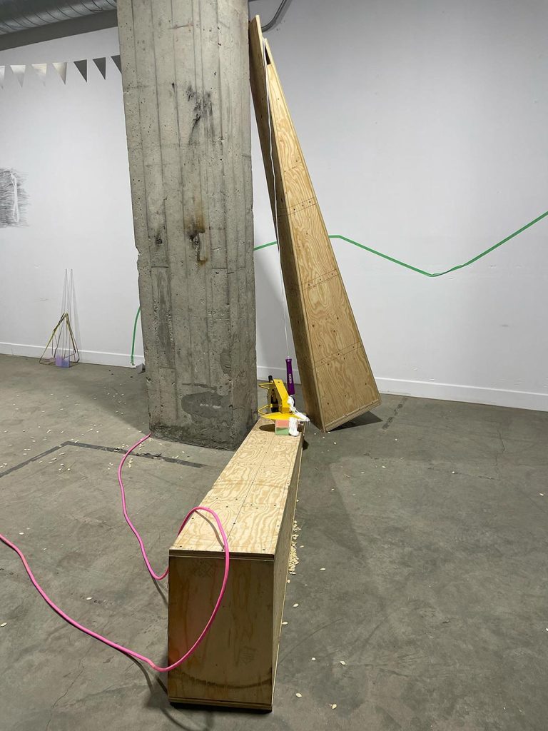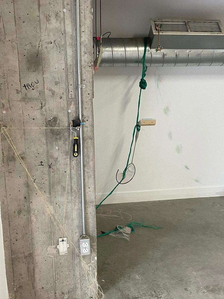 L’improvisation est une méthode centrale dans le cadre du projet Agence Augmentée, et ce, autant dans mes recherches performatives que j’ai réalisées seul à l’été 2022 que dans les expérimentations installatives, sonores et performatives réalisées en collaboration avec Isabelle Lapierre, Katia Martineau, Mathieu P. Lapierre et Vincent Thériault à l’été ainsi qu’à l’automne 2022. Une des tactiques pour organiser les divers matériaux constituant l’installation présentée à la Galerie des arts visuels de l’Université Laval à l’automne 2022 consistait à être attentivement à l’écoute de tout ce qui se trouvait déjà dans l’espace pour que celui-ci puisse être lu comme une partition guidant nos improvisations installatives. En fait, anciennement Les Copies de la Capitale, ce lieu était loin d’être un White Cube, car il était plutôt irrégulier et « bruyant » sur le plan visuel. Ainsi, je demandais à mes collaboratrices et collaborateurs d’être à l’écoute de toutes ses taches et irrégularités afin que les objets que nous déposions dans l’espace interagissent avec celles-ci et que toutes les entités dans l’espace d’exposition deviennent interdépendantes.