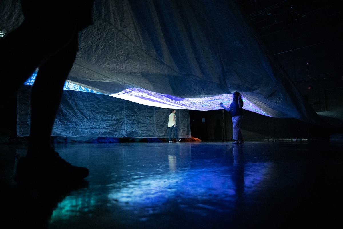 Quand nous racontons Anticosti, nous nous emparons de la grande bâche de dix-huit mètres de long qui recouvre le plateau pour la convertir en une vague avivée par les performeur·euses. Le poids du matériau, sous l’effet de nos secousses, prend l’air et appelle à une écoute et une manipulation collectives, une « conspiration » (Macé, 2023 : 12) pour tenter des variations sonores et spatiales pouvant gagner en souffle et en hauteur. Puis, quand la respiration est au plus fort, Julie Andrée se glisse en dessous. Là, nous lâchons la bâche qui vient l’envelopper en la transformant en une structure flottante, imprégnée de nos remous et dont la vibration suscite le silence. Néanmoins, cette action n’est pas unique. Son possible lyrisme est déjoué par des résonances sonores et visuelles réparties à plusieurs endroits du plateau. La « co-vibration » se construit sous l’effet d’accumulation de contrepoints, un jeu de dispersion qui nous semble transposer l’équivocité de notre expérience sur le terrain. Cette dramaturgie du fluide, comme le relève de Morant, « oblige le spectateur à être attentif au moindre des gestes comme à manifester d’une volonté d’implication » (de Morant, 2007 : 236).