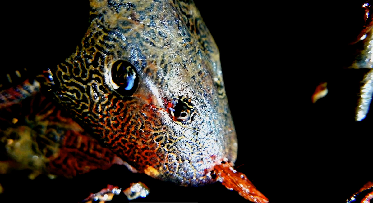 À travers son balado intitulé Ticoya Obscura10vimeo.com/536887478, Andrée-Anne souhaite transmettre son ressenti des lieux, soit un état vaporeux qui l’invite à vivre son écoute comme un rêve éveillé. Elle évoque la confusion entre la présence de l’eau et celle de la jungle, le rapport fluide qui s’établit entre les deux, leur coexistence de l’un à travers l’autre. Sur l’Amazone, on entend la jungle, et au milieu de la selva (forêt), on est sur les traces du fleuve. Elle veut aussi mettre de l’avant l’une des ressources les plus importantes de Puerto Nariño et dont dépendent les habitant·es : le poisson. Pour Andrée-Anne, celui-ci est le souffle de la population amazonienne, son économie, sa nourriture et une bonne part de son identité11Lors de notre séjour, nous visitons le Centro de Interpretación Natütama (« natütama » signifie « monde sous les eaux » en langue tucyne). Nous assistons à une installation (son et lumière) composée de sculptures en bois grandeur nature de la faune et de la flore qui se cachent sous les eaux troubles et opaques de l’Amazone : dauphins, lamantins, loutres, tortues, pirarucús, etc. Les légendes mises en scène montrent combien le plus-qu’humain maritime compose l’histoire et l’identité des personnes amazoniennes.. Elle qui déteste en manger se retrouve rapidement fascinée par la vie de village qui tourne autour de ce plus-qu’humain. Servi matin, midi et soir, de toutes les manières, de la soupe au poisson frit, c’est le menu de toutes les occasions. Les plans de caméra de pêche sont tous très contrastés pour laisser la trace du vivant de ces animaux, mais aussi pour magnifier leurs derniers souffles en saluant leur existence et le don qu’on en reçoit. Dans la capture d’écran ci-dessus, le traitement des images et de la couleur fait ressortir, malgré son étrangeté, la beauté de l’animal. En insérant d’aussi gros plans, Andrée-Anne laisse à la matière son espace d’écriture, rejoignant sans conteste le « matérialisme vitaliste » de Jane Bennett (2010), qui « fait feu de tout bois quand il s’agit de transmettre l’intuition et la conviction d’une vitalité inhérente aux choses, et plus largement de l’erreur des catégories qui opposent la vie animée et subjective à la matière inerte » (Granjou, 2014 : 842). La substance iconique de ces images figure ainsi l’attention de l’artiste et sa « co-vibration » (Chion, 2023) avec l’animal et le flux de vitalité qui persiste au-delà de son vivant.