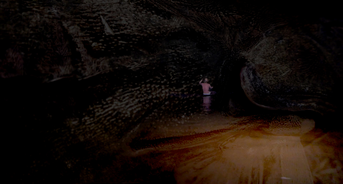 Dans une écoute qui dépasse le sonore18À propos du concepteur sonore Félix Blume, Fanny Dujardin affirme que « l’écoute dépasse le sonore : écouter c’est aussi prendre en considération, accepter une présence, donner son attention » (Dujardin, 2022 : 35)., son corps au sein de la grotte est saisi par la tension de son mouvement spontané et par un conflit des temps : celui, au présent, de son geste; et celui, au passé très lointain, auquel il associe le bruit qu’il entend. Bien sûr, cette configuration est le fruit d’une sensation réelle et imaginaire. Mais depuis l’entredeux de cette situation spatiotemporelle, même si le corps de Pierre bouge peu, il est comme activé par la fluidité. Sa perception compose alors la structure de sa captation audio et vidéo; on pourrait dire qu’elle esthétise sa condition de fluidité. Grâce au mécanisme de la caméra 3D, ici en contreplongée, Pierre filme l’espace en 360°, restituant autant la continuité de l’instant que le conflit anachronique de cette fluidité. L’opération expose certes la matérialité de son écriture fluide, mais renvoie également à une image du temps impermanent qui affecte son corps et le raconte. Cette instantanéité in situ, éprouvée entre le paysage souterrain et lui, annonce un devenir fluide, soit un processus d’écoulement vers une sorte de personnage « inséré dans une dynamique de flux » (de Morant, 2007 : 216). Pierre touche alors à des « potentiels du temps » (de Toledo, Imhoff et Quirós, 2016) où le récit informel du son des fossiles devient possible. Cette dramaticité du corps submergé par le paysage et fictionnarisé par la temporalité fluide se déploie dans la dernière expérience anticostienne que nous souhaitons évoquer, soit une écriture en co-paysage assumée qui nous mène de manière plus évidente vers un projet écodramaturgique.