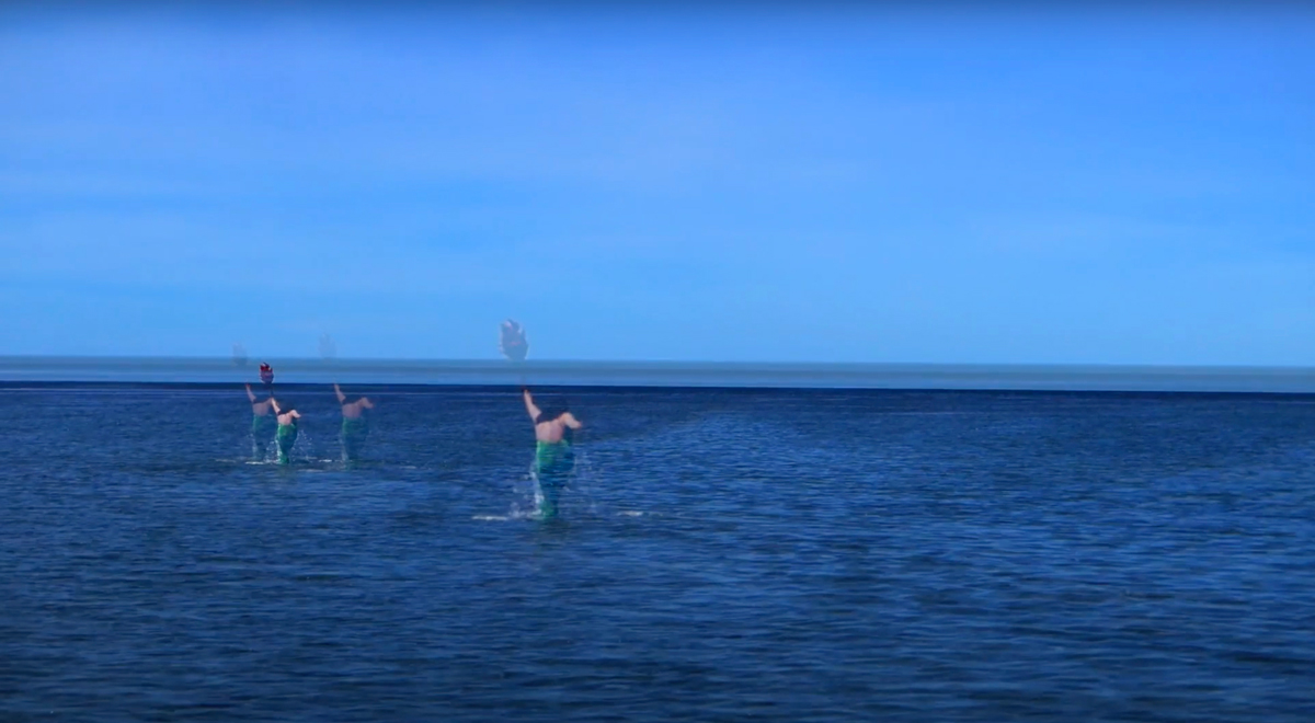 La performance devient ici une écriture polymorphique in vivo et vibrante, une coécriture performative où le personnage révélé par le geste filmique s’infiltre dans l’histoire impermanente du fleuve. Mais à travers le filmage, Andrée-Anne énonce une question qui nous a travaillé·es à de multiples reprises pendant notre séjour : comment tenter d’écrire le paysage fluide comme il nous écrit? Composée de différents points de vue de l’action, la prise d’images rend compte de la fluidité entre les deux performeuses et le cap. Cette circulation rythmée n’est pas sans rappeler la vibration sonore se propageant au gré des oscillations des éléments qui occupent le paysage. Le balado se conclut sur une Julie Andrée sirène qui se dédouble, à l’image d’une onde sur l’eau ou d’une danse avec le fleuve; de plus en plus lointaine, elle rejoint peut-être le son perdu des fossiles.