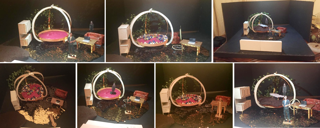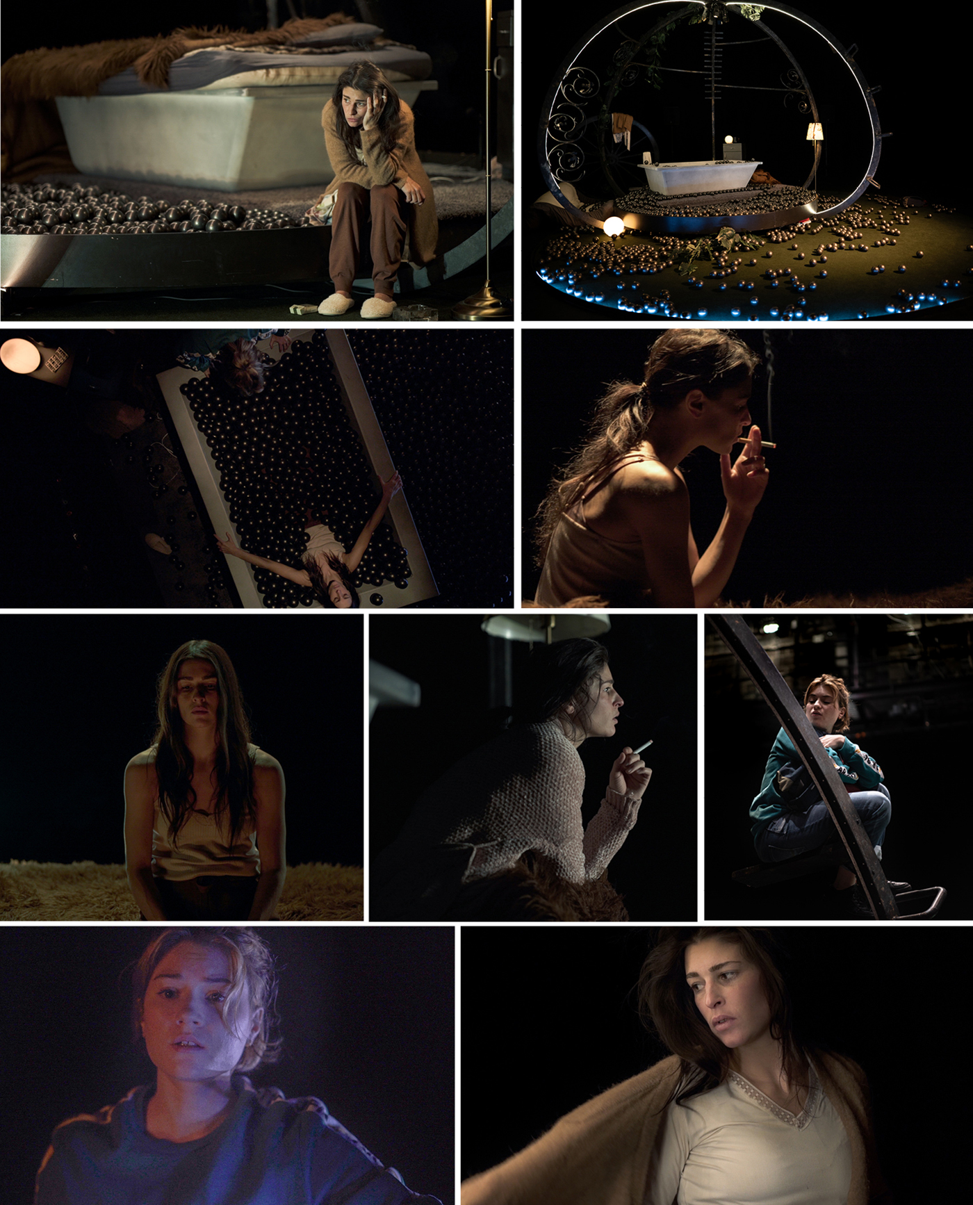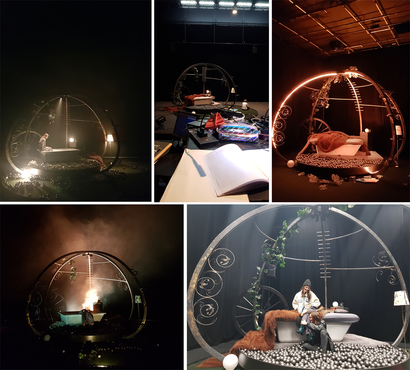 Scénographie en cercles concentriques (public, appartement, chambre / carrosse). Environnement quotidien qui se métamorphose, entre l’hyperréaliste et l’onirique. Il faut une porte et une fenêtre au carrosse, que ça ne soit pas une prison. Sous la fourrure de la chambre, un bain de perles, la baignoire de la sirène. À l’arrière, un junk yard, jardin laissé à l’abandon où pourrissent les voitures. Le carrosse allait quelque part, il s’est arrêté, il faut le réparer pour qu’il reprenne son chemin. Comment le réparer? Pour aller où? Ce qui fait le carrosse, ce sont les roues. Siège de cocher. Mettre un cric, par exemple.