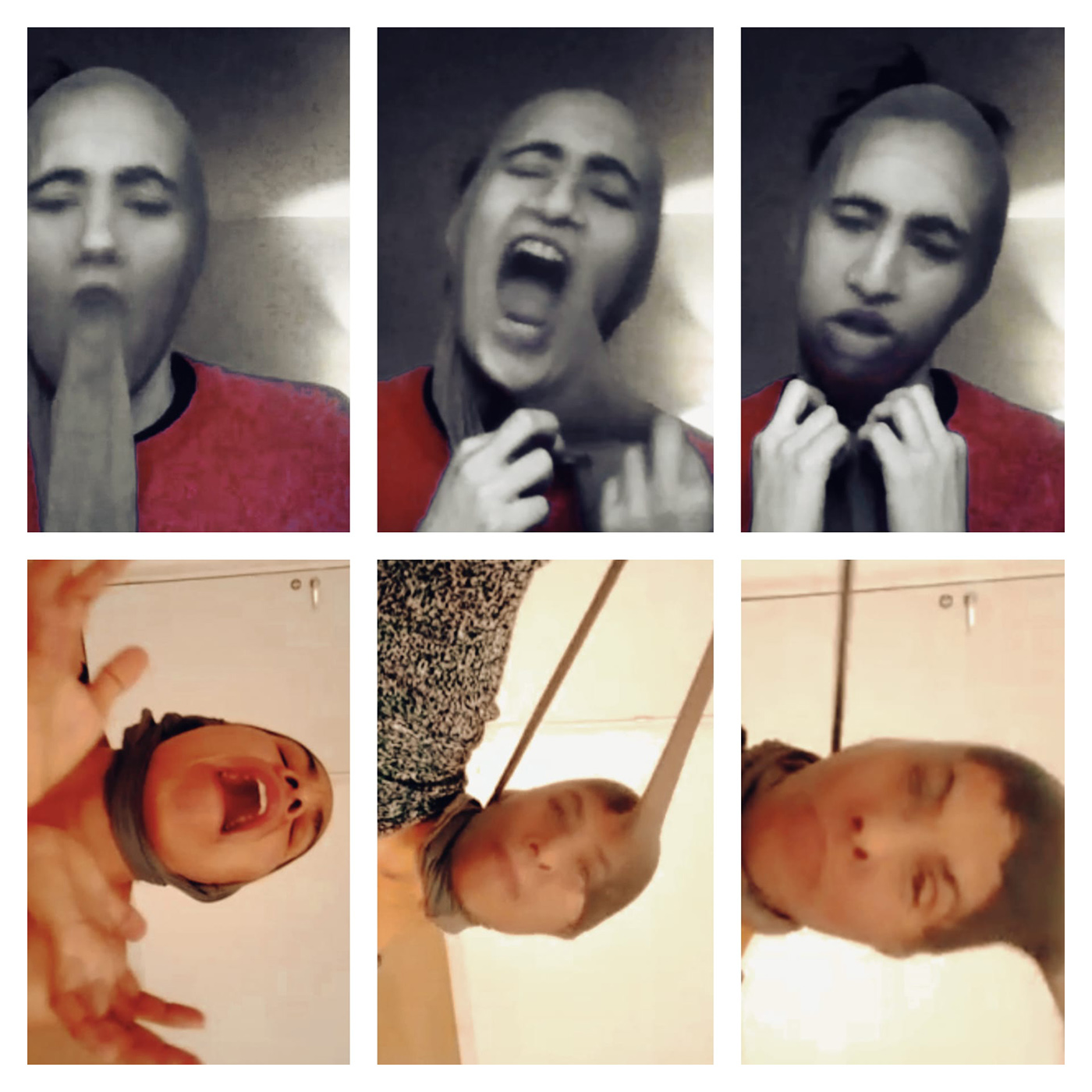 Puis Zena me propose de sortir les rouges à lèvres et d’improviser dans les toilettes qui ont un carrelage noir, c’est très cabaret. On ne peut pas se filmer ni performer à deux. On retourne au studio… On finit par se retrouver face à face, maquillées de rouge sur tout le visage, et on ose se regarder, se faire la grimace. On communique, on essaye de se faire rire, de se séduire. On essaye de se dégoûter. On sort de l’inhibition, des expressions toutes faites du visage pour essayer de le tordre. Il est déjà 18 h 15. On refait une dernière impro sur la Freddy, avec comme idée que le visage est une partie du corps comme une autre, indépendante, mais qui ne joue pas seule. Jeu sur la blessure amoureuse, pleurer, chanter, exalter avec elle.