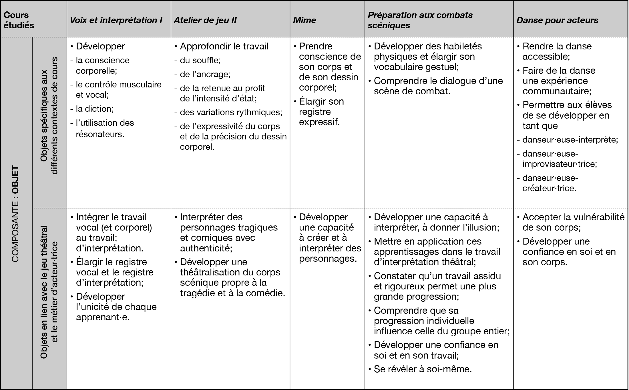 La prise en considération de la composante « objet » permet, quant à elle, de saisir les objectifs vers lesquels s’orientaient les stratégies et les approches rapportées ici-bas. D’emblée, si chaque professeur·e construisait son cours à partir de ce qui relevait de son champ d’expertise, aucun·e ne prétendait à ce que les apprenant·es deviennent des spécialistes de la technique qu’il·elle enseignait. Mis au service du jeu, ces cours du programme de formation incitaient les étudiant·es à se définir en tant qu’acteur·trices et à apprendre sur le contexte de la scène professionnelle tout en profitant de cette zone de sécurité qu’assure le contexte pédagogique. Faisant vivre des approches diversifiées, ces cours permettaient notamment qu’advienne une fusion entre le travail vocal et le travail d’interprétation, que soient acquis des outils liés à la construction physique de personnages, à l’interprétation de combats scéniques, de scènes tragiques et comiques ainsi qu’à la mise en scène d’une écriture du corps. Il va de soi que chacun·e mettait de l’avant certains objectifs tantôt spécifiques aux techniques et domaines enseignés, tantôt tournés, de manière plus générale, vers le jeu théâtral et le métier d’acteur·trice.