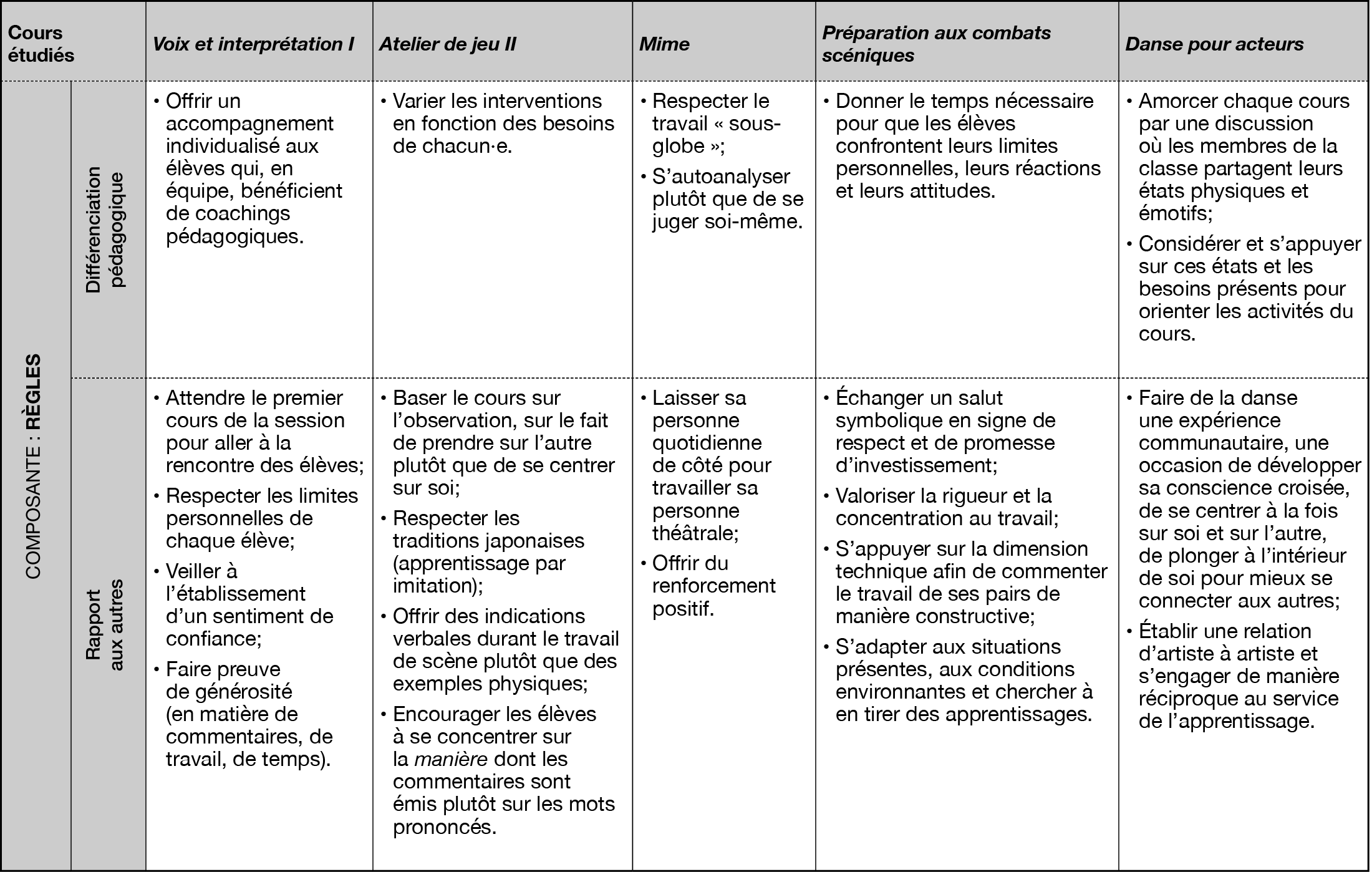 Si les cinq cours incitaient les étudiant·es à mieux comprendre leur propre corps et à mieux l’utiliser, ils mettaient également tous l’accent sur le rapport à l’autre. Dans chaque contexte d’apprentissage, les apprenant·es travaillaient au contact de leur professeur·e et de leurs collègues. Par exemple, le cours Voix et interprétation I leur faisait réaliser certains contacts physiques (ciblant le visage, la gorge, le torse ou l’abdomen) parfois nécessaires au travail vocal et les invitait à veiller au confort physique de leurs pairs à travers différentes explorations. Le cours Atelier de jeu II, quant à lui, leur proposait d’apprivoiser le concept du ma4En fonction de ce concept, les étudiant·es cherchaient à occuper, par le prolongement de leur énergie, l’espace entre deux corps, entre deux personnes. Un article portant spécifiquement sur l’enseignement de Martine Beaulne (Skelling Desmeules, 2019) approfondit ce type de travail.. Le cours Préparation aux combats scéniques les poussait à s’entraider et à s’encourager pendant l’exécution d’exercices techniques et la répétition de chorégraphies, tandis que les autres cours (Voix et interprétation I, Mime et Danse pour acteurs) les conviaient à entrer dans un travail de chœur. Le cours Danse pour acteurs avait de surcroît comme visée de faire de la danse une expérience communautaire. Lors des séances en sous-groupes, les étudiant·es se pratiquaient habituellement sous le regard de leurs pairs. Était ainsi développée une ouverture à l’autre, au fait d’être observé·es : « Cet état d’ouverture est aussi celui qu’il[·elles] d[evaient] maintenir face aux jugements et aux suggestions des autres » (Kuhlke, 2003 : 100). C’est donc dire que le travail du corps, bien qu’unique pour chaque étudiant·e, se réalisait constamment en relation aux autres, comme c’est le cas dans le milieu professionnel. Les nombreuses règles explicites ou implicites au sein de ces cours, rapportées dans le prochain tableau, conduisaient toutes à l’établissement d’un respect de soi et d’autrui, d’un sentiment de confiance, ainsi qu’à la création d’un climat de partage et d’entraide.
