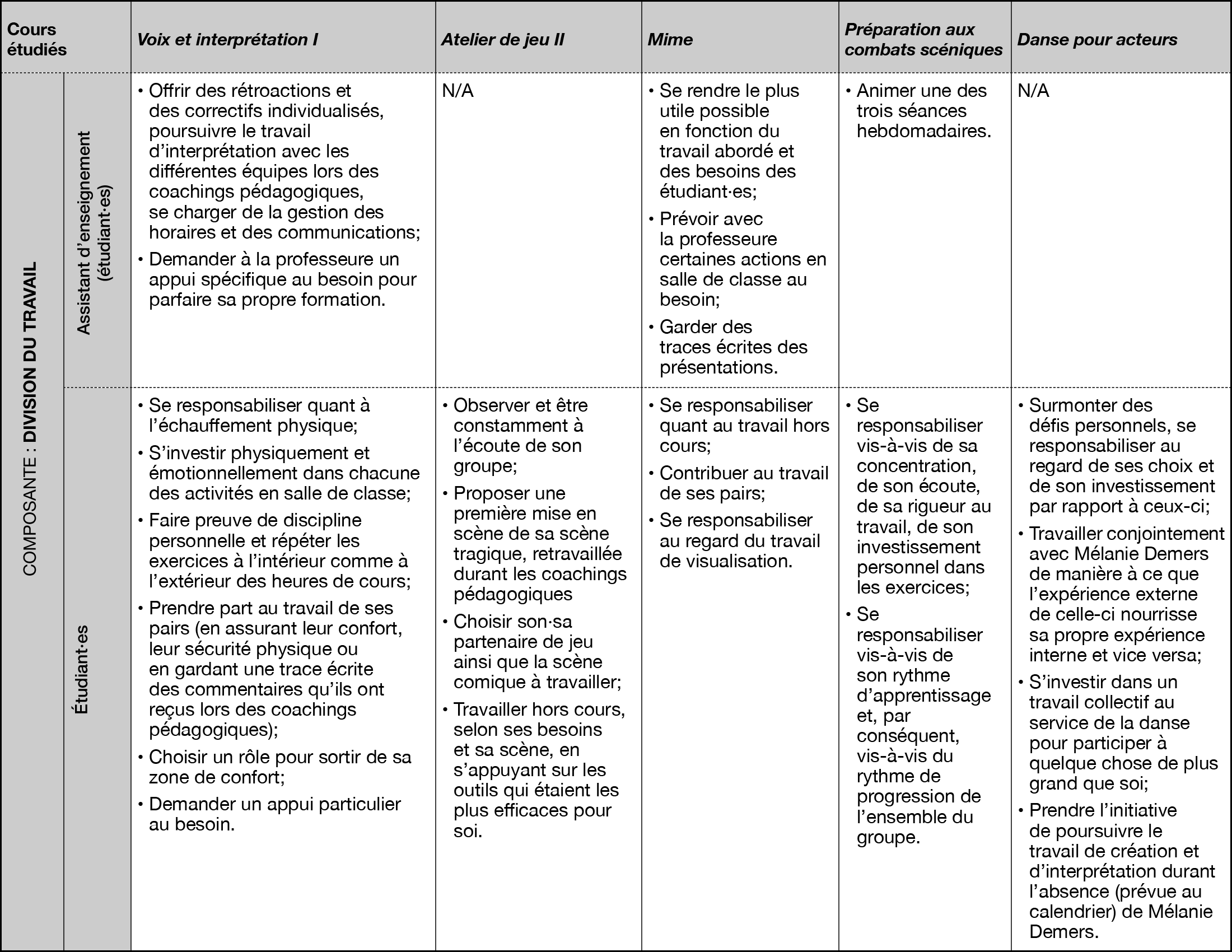 En ce qui concerne les étudiant·es, chaque contexte de cours les responsabilisait à leur propre corps. Par leur engagement dans les exercices proposés et leur écoute attentive des commentaires qui leur étaient adressés par leurs professeur·es et les assistant·es, chacun·e apprenait à connaître l’instrument que constitue son corps et se familiarisait avec ses forces, ses limites, ainsi qu’avec ses besoins en matière de travail corporel. Lorsqu’un·e étudiant·e faisait face à une difficulté technique spécifique, il était de sa responsabilité de demander aux professeur·es un accompagnement supplémentaire afin de la surmonter, en se référant au besoin à Pascal Belleau durant ses temps de disponibilité à l’extérieur des heures de classe, à Huy Phong Doan à l’intérieur des séances en salle de classe, à Martine Beaulne durant les séances de coaching pédagogique ou à Francine Alepin durant un temps hors cours réservé à cet effet. Expert·es de leur propre corps, les apprenant·es développaient l’intuition de sélectionner parmi les outils proposés dans le cadre des cours ceux qui leur étaient les plus efficaces dans leur travail. Il·elles prenaient ainsi conscience des exercices qui leur apportaient un maximum d’effets bénéfiques. Le tableau suivant rapporte une synthèse, mise en lumière par la présente recherche, des éléments associés aux composantes « division du travail ».