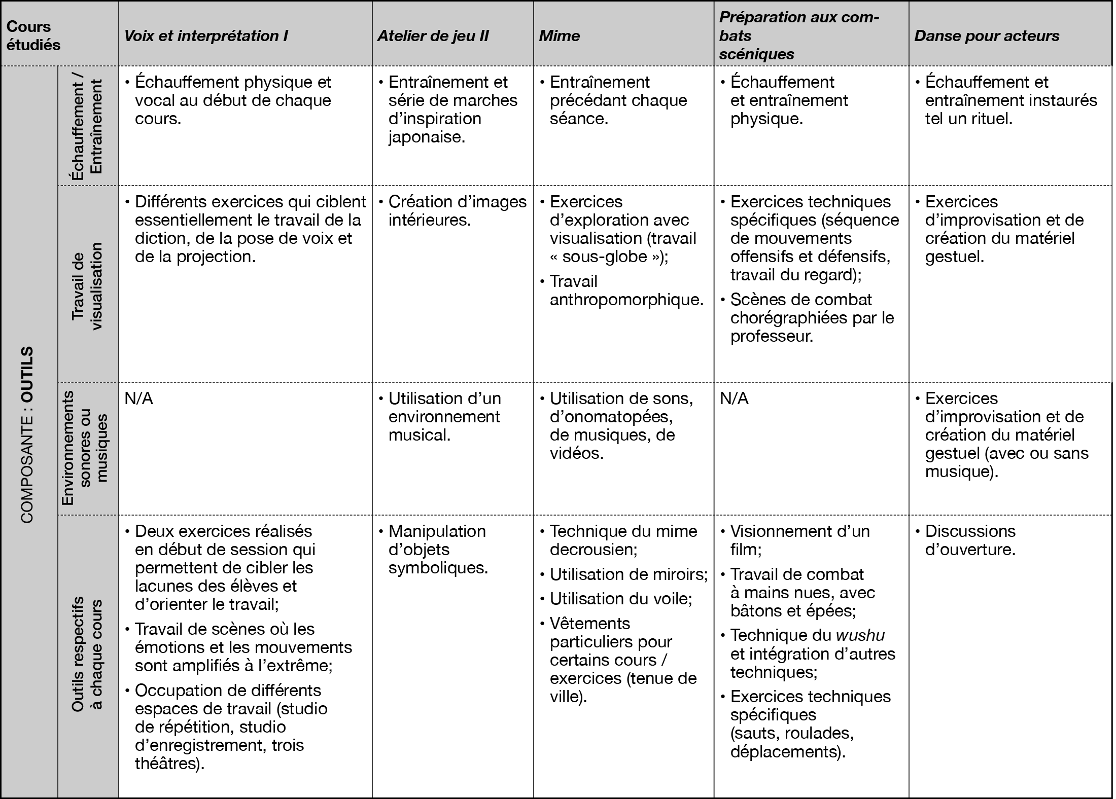 Durant leur formation, les étudiant·es apprennent à se mettre en état de disponibilité au jeu, un état favorisant la concentration, la réceptivité et l’engagement actif. En mettant en relation les différents cours au regard de la composante « outils », il est possible de faire ressortir certains types d’outils récurrents d’un cours à l’autre afin d’augmenter la capacité des apprenant·es à être entièrement présent·es lors du travail de scène. Ces outils se rapportent notamment à l’adoption d’une routine d’échauffement, à la poursuite d’un travail de visualisation, à l’utilisation d’environnements sonores, de musiques ou de silence, puis à la création d’exercices spécifiques à chaque cours.