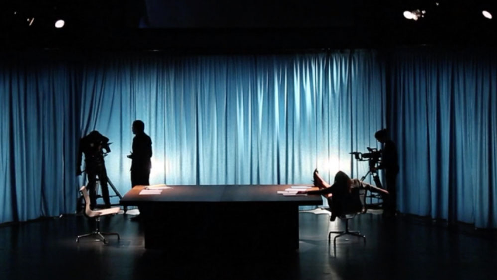Le Grand débat fait partie d’un cycle documentaire, imaginé par Émilie Rousset et Louise Hémon, autour des rituels et qui compte trois courts films9L’un de ces trois films porte sur « les gestes du dimanche électoral », et s’intitule Le vote. Les autres portent sur des rituels appartenant à d’autres sphères, privées ou professionnelles : l’anniversaire et la navigation. et un spectacle. Elles cosignent chacune de ces œuvres, affirmant ainsi la dimension indissociable dans la construction dramaturgique de l’ensemble, de la narration visuelle et de la narration textuelle. Il est significatif qu’Émilie Rousset, issue de l’une des plus prestigieuses formations à la mise en scène française (l’École supérieure d’art dramatique du Théâtre National de Strasbourg), ait forgé son écriture scénique au contact de pratiques qui l’ont éloignée quelque temps des plateaux théâtraux : le cinéma documentaire ou les pratiques muséales (installations) ont ainsi pris une large part dans les propositions qu’elle a pu construire avec Louise Hémon ou aux côtés de la dramaturge Maya Boquet depuis 2015. Au fil de ces expériences, la metteure en scène a construit une identité dramaturgique forte au sein de laquelle écriture cinématographique, création sonore et archives s’entremêlent; elle qualifie d’ailleurs les textes de ses spectacles de « bande[s]-son », qu’elle ne couche elle-même jamais à l’écrit10Elle fait appel pour cela à une société qui prend en charge la transcription écrite des dialogues dans le but de créer une conduite, notamment pour les équipes techniques et les comédien·nes.. La médiatisation de la parole occupe une place centrale dans les thématiques qu’elle déploie : Rencontre avec Pierre Pica (2018) fait état de ses conversations, par Skype, avec le linguiste Pierre Pica, ainsi que des recherches de celui-ci sur le peuple des Munduruku; Reconstitution : le procès de Bobigny (2019) retrace le procès de Marie-Claire Chevalier en 197211Procès pour avortement à la suite d’un viol, il constitue un moment historique du droit des femmes en France, qui « cristallise les réflexions et combats féministes de l’époque, avec notamment les contributions de Simone de Beauvoir, de médecins Prix Nobel, de Delphine Seyrig ou de Michel Rocard » comme l’explique la metteure en scène, dans le dossier artistique du spectacle., plaidé par Gisèle Halimi. Ces spectacles mettent tous en scène des dispositifs médiatiques, plus ou moins anciens – la télévision, l’ordinateur ou le procès – qui portent aussi l’interprétation; en effet, pour chacun d’entre eux, les interprètes sont équipé·es d’oreillettes leur transmettant en direct les discours et entrevues qui font la matière du spectacle. Le jeu s’apparente alors à une forme de reconstitution de la parole entendue – et non plus à une mémorisation du texte lu – l’emportant vers la restitution de la matérialité d’une parole, avec ses inflexions, ses respirations, ses ratés. C’est donc tout le processus de création – des recherches initiales au travail de plateau – qui est influencé par l’environnement médiatique dans lequel il évolue. Aujourd’hui, Rousset réfléchit à la publication de sa dernière partition scénique – celle de Reconstitution : le procès de Bobigny – au sein d’une édition papier qui prendrait en charge l’ensemble des documents d’archives ayant participé à l’écriture de cette pièce12L’artiste est en discussion avec la maison d’édition Macula, maison qui publie des ouvrages d’art et des éditions critiques..