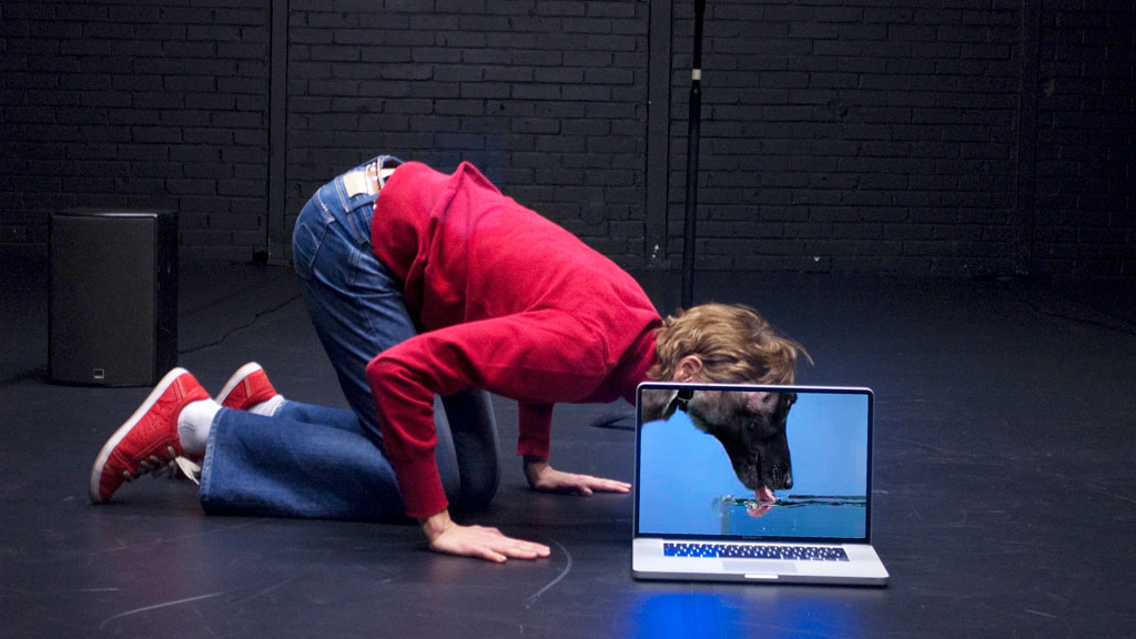 Depuis une dizaine d’années, le duo d’artistes Giuseppe Chico et Barbara Matijević se consacre aux imaginaires que fait naître le média social YouTube, particulièrement à travers l’un des formats les plus présents sur le site d’hébergement : le tutoriel. Leur spectacle Our Daily Performance, créé en 2018 dans le cadre des Rencontres chorégraphiques internationales de Seine-Saint-Denis, est l’aboutissement de cette recherche performative, après deux étapes successives : Forecasting (2011) et I’ve Never Done This Before (2015). Tous fruits d’un montage de séquences empruntées à la plateforme vidéo, chacun de ces spectacles prend une forme singulière. Forecasting est un solo chorégraphié pour une femme et un ordinateur portable. L’écriture y est avant tout visuelle, écranique, peu de texte régissant l’ensemble : la performeuse (Barbara Matijević puis, plus récemment, Charlotte Le May) y manipule un MacBook sur lequel s’affichent des tutoriels à l’échelle 1:1, incarnant des prolongements possibles du corps de l’interprète.