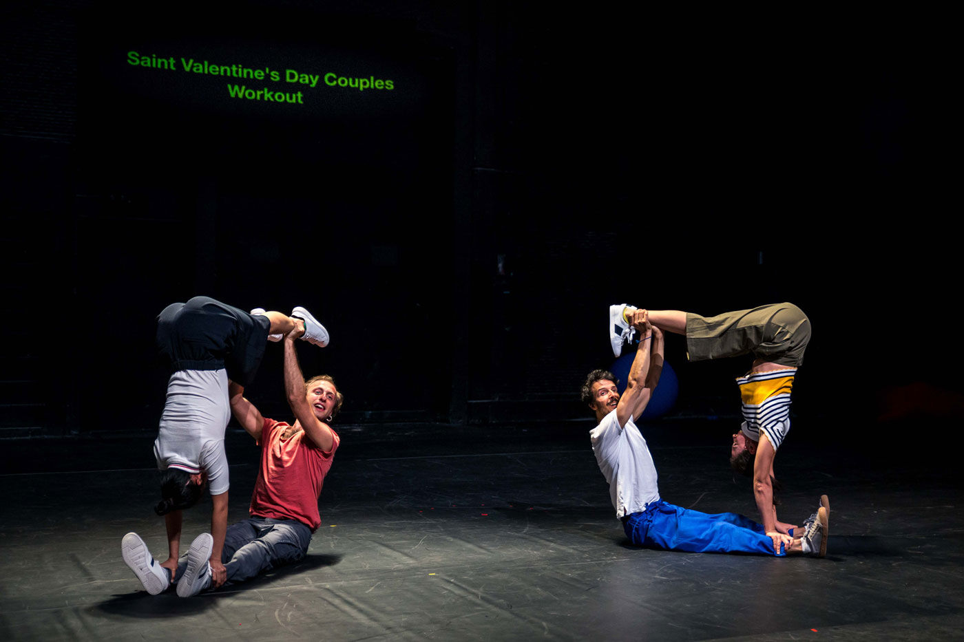 Our Daily Performance, avec (de gauche à droite) Shihya Peng, Pietro Quadrino, Nicolas Maloufi et Camila Hernandez. MC93, Bobigny (France), 2018. Photographie de Olivier Heinry.