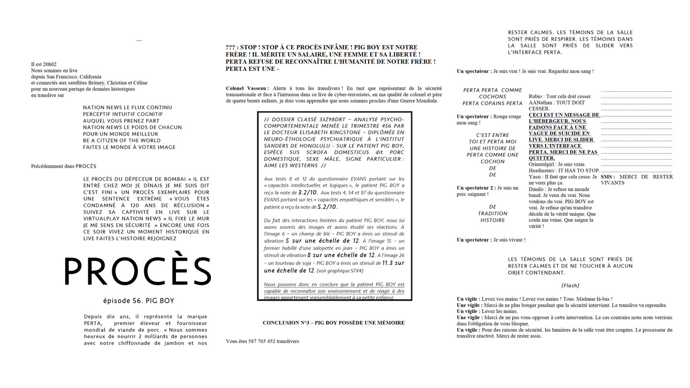 La deuxième partie, la plus longue, qui constitue le cœur même de cette étrange fable, mêle procès et live streaming. Dans un futur pas si lointain, un nouveau « flux » hybride, canal d’informations, diffusion, interaction et vote en direct. « Nation News le flux continu / Perceptif Intuitif Cognitif » (ibid. : 21) permet ainsi de suivre en direct le procès de Pig Boy, tout en y participant ou en revivant les faits de manière immersive :