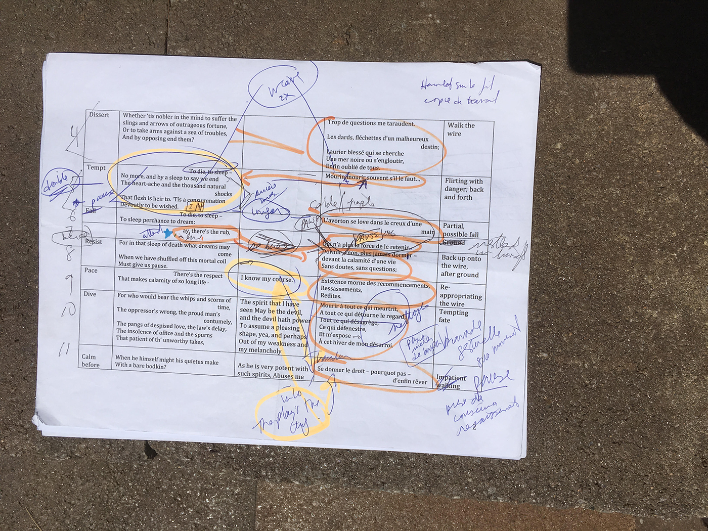 Le texte tient en cinq colonnes, la première donnant un ton à la micro-action de la séquence « Dissert », « Tempt », « Resist », « Pace », et ainsi de suite (c’était avant que le texte ne bascule vers le français). La deuxième colonne traduit le découpage du soliloque shakespearien dans le texte. La troisième colonne offre un espace liminal et référentiel, celui des échos qui résonnent intratextuellement, venus d’autres scènes de la pièce, parfois des traces d’autres pièces. La quatrième colonne habite ce qui devait être la voix du fil-de-fériste, soit une « tradaptation », trappropriation ou, plus simplement, une réponse résonante au soliloque en français, s’éloignant ainsi du texte canonique afin de permettre à un non-acteur dans la jeune vingtaine de le faire sien. Finalement, la cinquième colonne livre une description très sommaire du mouvement anticipé. Cette dernière « écriture » tient du fantasme, du souhait d’un auteur-metteur en scène qui n’a ni l’expertise ni la technique circassienne, mais qui connaît tout de même les codes de la discipline et le répertoire du fil-de-fériste sélectionné. Traces, suggestions, ces didascalies d’une mise en corps souhaitée ont vite été délaissées lors de l’écriture du plateau qui, elle, a imposé ses propres séquences et sa grammaire narrative et corporelle.