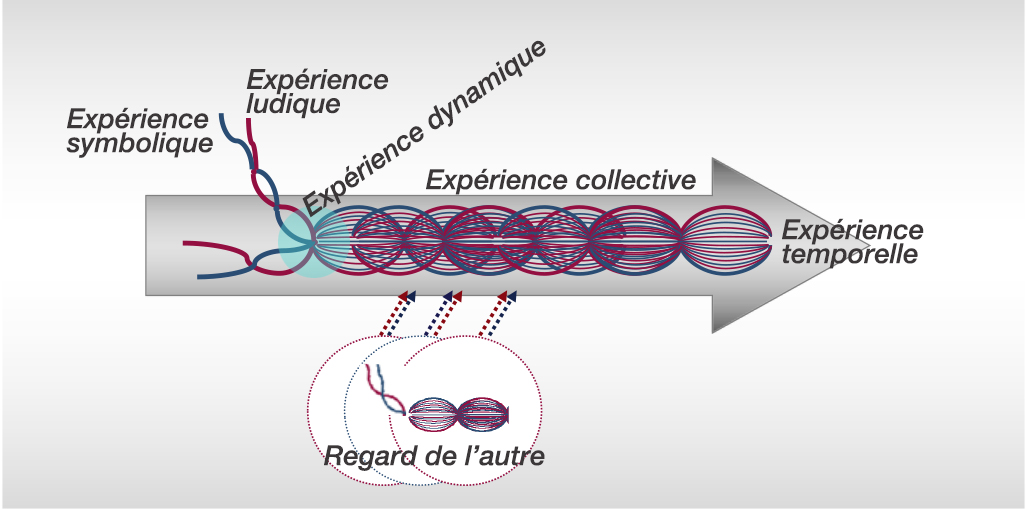 Nous allons présenter un bref résumé de chacune d’elles, uniquement dans le but de saisir dans quel contexte la mise en cohérence progressive de la démarche s’est effectuée. L’expérience symbolique est, tel que susmentionné, le don de soi vers l’autre. L’expérience ludique accompagne l’expérience symbolique. Générant toutes les autres, ces deux types d’expérience libèrent la force du désir, du plaisir et de la conscience investie dans le projet. L’expérience dynamique est une quête, un mouvement vers un but. Elle est une force agissante qui puise ponctuellement à la source des désirs et du plaisir. L’expérience collective est l’orchestre des forces, des énergies, des désirs de chacun·e. Le regard de l’autre concerne l’expérience du lien qui se construit avec autrui, responsable de la mise en scène, de l’animation ou de l’enseignement et possédant un pouvoir d’impulsion et d’instigation. L’expérience temporelle est le métronome des expériences qui agit comme règle commune.