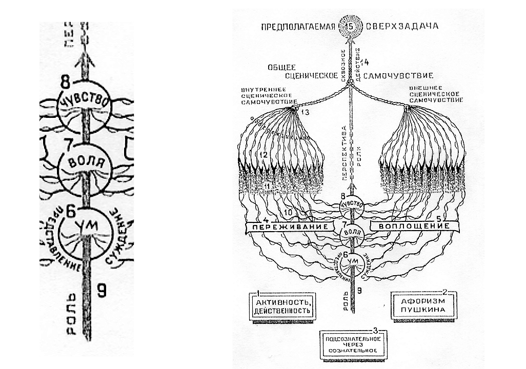 Le modèle théorique de Stanislavski, tel qu’il apparaît dans L’énergie qui danse : un dictionnaire d’anthropologie théâtrale (2008) d’Eugenio Barba et Nicola Savarese, représente le « travail de l’acteur sur soi dans le processus créateur de l’incarnation » (Poliakov, 2006 : 7). Ce modèle peut être considéré comme la première formulation graphique et scientifique d’une pédagogie théâtrale, fondée sur un ensemble de lois fondamentales et spécifiques de la création scénique. Les principes de plaisir, de désir et de conscience de soi y trouvent un ancrage. Stanislavski identifie dans le processus de création trois sources d’énergie, soit l’esprit, la volonté et le sentiment13Selon la traduction de Charles Antonetti (dans Stanislavski, 1984 : 299-318). (ou l’intellect, la volonté et l’émotion14Selon la traduction de Éliane Deschamps-Pria (dans Barba et Savarese, 2008 : 31).), et il les présente comme de très importants facteurs dans la préparation de l’interprète au jeu.