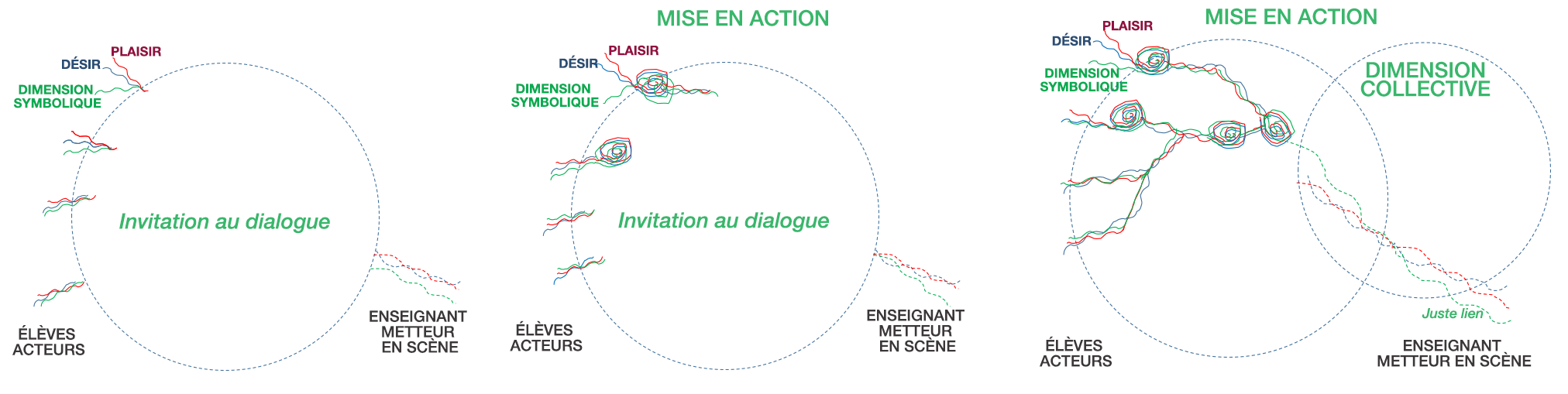 Il ne s’agit pas d’être seulement en relation, mais d’établir un lien qui, souple, s’ajuste continuellement en fonction du potentiel créateur de chacun·e. Ce lien advient parce que l’enseignant·e considère, dès le départ, les dimensions informes qu’est le maillage de la conscience de soi et du couple plaisir / désir, et qu’il·elle exploite leur potentiel :