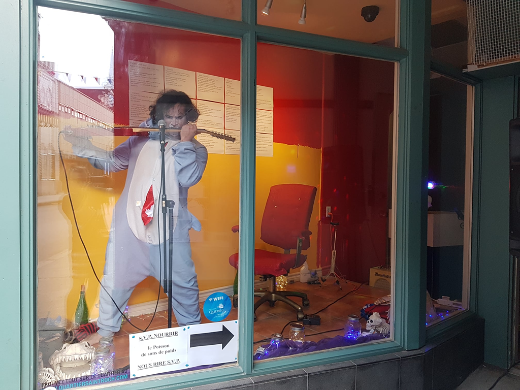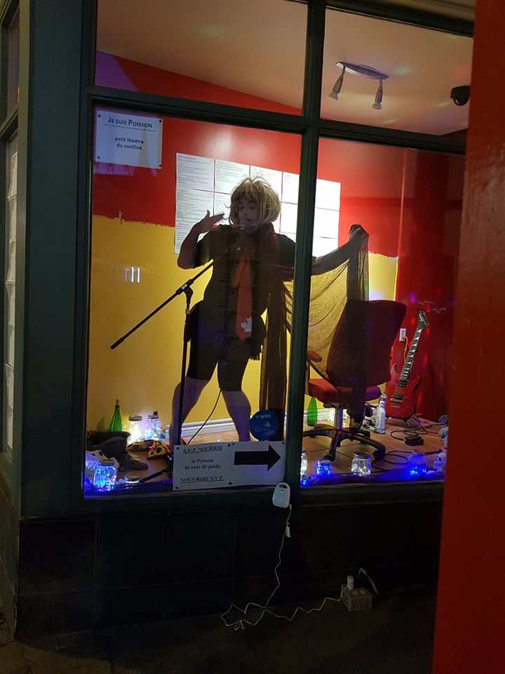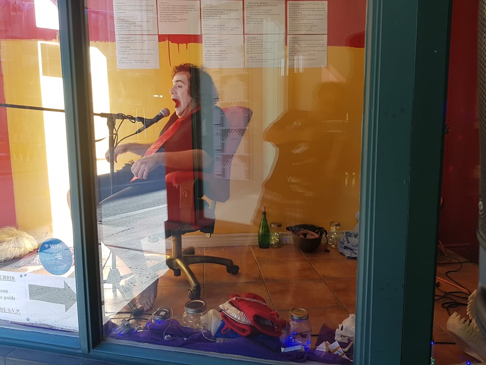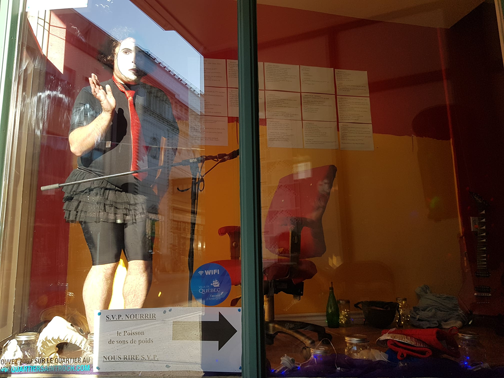 C’est notamment le cas dans Je suis Poisson (2021), une performance qui reprend l’univers de Panpan!, diffusée dans le cadre de Ton local, mon bocal, une présentation du Tremplin d’actualisation de poésie (TAP), dirigé par André Marceau . En effet, tandis que Langlois performe dans une vitrine donnant sur une rue passante, il joue au gré de ses inspirations : même si un canevas de base a été préparé, le performeur se permet de choisir aussi des segments de Panpan! suivant son instinct ou la disponibilité du public à interagir avec lui. Ensuite, les segments choisis sont modulés en fonction des interactions avec ceux et celles qui passent. Je suis Poisson s’inscrit dans une volonté de Langlois à travailler de plus en plus des tâches performatives30C’est-à-dire liées à la « performance (per- + -formance) [qui] peut être entendue comme le processus même de “production d’une forme” ou comme action ou processus conduisant à une forme. Il s’agit donc de la mise en forme de certaines qualités » (Dospinescu, cité dans La Chance et Martel, 2013 : 23), selon Dospinescu; pour une discussion plus large de la notion, voir aussi son article « Aspects généraux de la performativité » (2011). appliquées à l’appareil expressif de la personne de l’artiste. Pensons, par exemple, à l’épuisement qui s’installe progressivement dans la performance et qui peut mener à une confusion mentale en partie recherchée par l’artiste, qui le rend disponible à des réactions ou à des comportements inattendus de la part du public, en stimulant ainsi le côté performatif. Cette approche casse la rigidité ou le formalisme d’une partition gestuelle fixe de slam-théâtre méthodique. Ultimement, la liberté d’expression que procure la performativité dans Je suis Poisson, si développée à son plein potentiel, permettrait également de jouer avec la logique d’embranchements dramaturgiques des figures typées de la mécanique dramaturgique. En effet, les changements en temps réel qu’opère le performeur, notamment lorsqu’il alterne d’une figure typée à l’autre et d’un segment de texte à l’autre, s’effectuent non plus en fonction d’une partition de jeu fixe, mais en fonction de ses interactions avec le public. On voit donc, à travers le discours de la persona scénique en situation de performance, poindre la vulnérabilité de la propre personne de l’artiste, ou du moins du poète-acteur que porte celle-ci. C’est cette présence soudainement intime qui vient insuffler une vie, un caractère imprévisible à la tendance parfois mécaniste et trop réglée de la biomécanique.