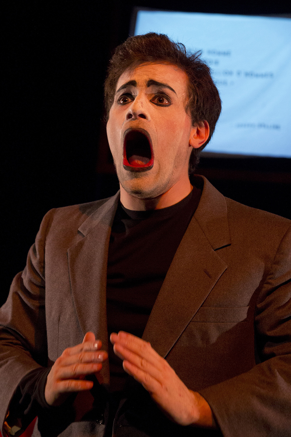 Par l’intégration de la biomécanique de Meyerhold dans sa poésie, Langlois espérait charger l’expressivité de son jeu d’une densité poétique15Langlois doit la notion de « densité » poétique à André Marceau, présentée lors d’une discussion conviviale et informelle. à la mesure de celle des textes mis en scène, d’où l’intérêt d’explorer une technique affranchie de la quotidienneté du jeu strictement réaliste et fondée sur le travail du corps et de la voix de l’interprète. L’objectif était d’ouvrir le jeu à une esthétique symboliste, voire excentrique, misant sur une expressivité corporelle et vocale qui cherche l’insolite, l’étrange, le grotesque. Si l’insolite est poursuivi de façon tout à fait naturelle par Langlois, dans le sens d’une quête légitime d’originalité au niveau de la création16En témoigne l’idée au fondement même du slam-théâtre de Langlois, soit celle de saisir l’opportunité d’une hybridation entre slam et biomécanique meyerholdienne : il s’en dégage une volonté forte d’exploration, de renouvellement de sa propre discipline artistique., les deux autres aspects présentent des liens puissants avec des pratiques esthétiques déjà éprouvées dans l’histoire du théâtre et qui se sont constituées en options créatives parfaitement assumées. Ainsi, dans l’approche du jeu de Langlois, l’étrange renvoie à la vision théâtrale de Bertolt Brecht, qui mise sur l’effet de distanciation ou d’étrangéisation (dans une version calquée de l’expression allemande « Verfremdungseffekt »). Sans entrer dans les détails de la notion théorique et du jeu qu’inspire le concept, il suffit de lire les définitions de Bertolt Brecht telles que rapportées et commentées par Patrice Pavis :