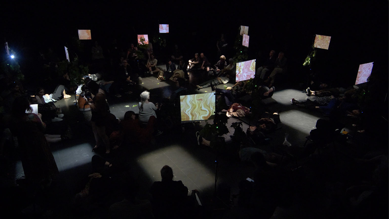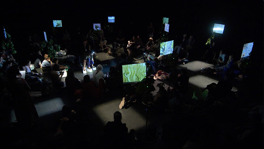 Malgré les développements exponentiels des technologies qui caractérisent notre époque, « la plupart des théâtres opèrent encore selon le paradigme hérité du XIXe siècle » (Salter, 2019 : 159), ce que Peter Brook a défini comme le théâtre « mortel » (« deadly »), soit « un théâtre tel qu’il l’était à la naissance du cinéma : théâtre à places réservées, avec foyer, fauteuils en velours, rampe, changements de décor, entractes, musique, comme si le théâtre n’était que cela et rien de plus » (2014 [1968] : 25). Nous pouvons dire que la technologie est aujourd’hui globalement intégrée sur scène, l’intermédialité ayant permis d’en creuser et d’en cerner plusieurs incidences dans le domaine des arts. Cependant, au théâtre, cette technologie demeure la plupart du temps assujettie au texte ou à la chorégraphie, dans un rapport frontal des spectateur·trices à l’œuvre. Cette binarité, maintenue en arts vivants malgré les porosités interartistiques du courant postdramatique, tient beaucoup à l’architecture des salles de spectacle et impose un renouveau hors des murs des théâtres. Le décloisonnement de cette binarité vers une mise en relation à l’œuvre souple, indéterminée et modifiable instaure, à travers une déhiérarchisation relationnelle, une posture qui s’inscrit dans une pensée écologique. Ce réaménagement des rapports entre êtres humains et autres qu’humains engage de nouvelles modalités d’écoute et de participation vers un agir politique.