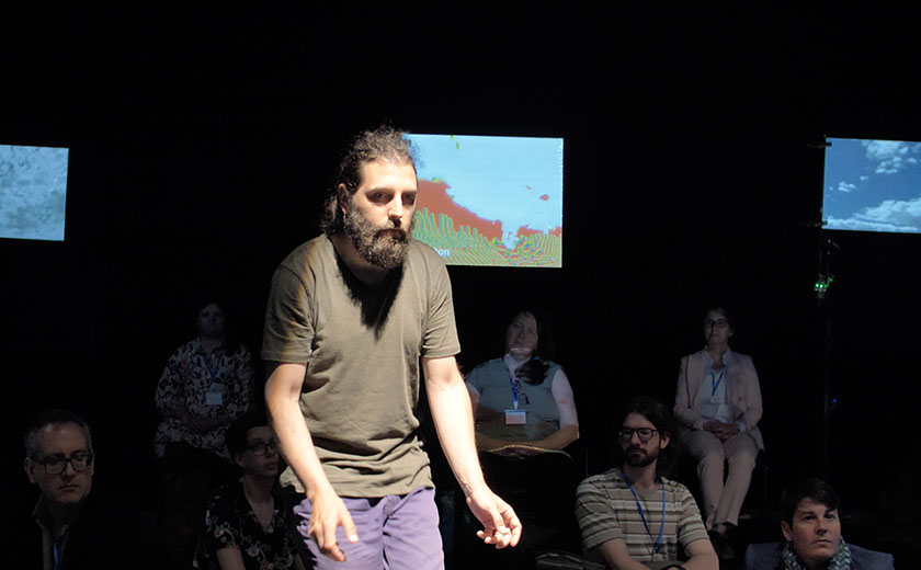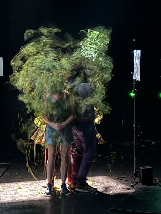 La performance vise à rendre palpable la dimension interactive relationnelle des corps en présence, vivants et non vivants. Ainsi, dans le premier tableau de la deuxième itération, trois performeur⸱euses marchent au ralenti, comme dans un temps suspendu, passant d’un microdispositif à l’autre sous le chant tonitruant des douze insectes. Dès que les corps des performeur⸱euses se trouvent à proximité de l’un des douze microdispositifs, les images et les sons de celui-ci subissent une transformation importante. Du même coup, les corps des performeur⸱euses apparaissent soudainement traversés de tremblements et de soubresauts, comme si la perturbation des sons d’insectes et des images de ciel causée par ce rapprochement renvoyait l’action vers le⸱la performeur⸱euse, le⸱la perturbant à son tour, dévoilant l’impact mutualisé des actions et leurs enchevêtrements. Le deuxième tableau s’ouvre sur un court extrait d’un magnifique texte de Marielle Macé, Respire (2023). Cette lecture se prolonge dans l’interaction entre le souffle des trois performeur⸱euses et les ciels projetés, modulant les couleurs et les formes des nuages au gré des différents souffles réalisés, selon le rythme, l’intensité et la texture de ceux-ci.
