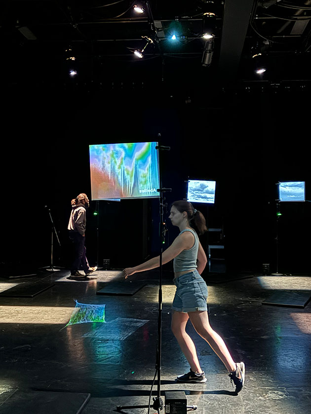 Dans le cadre de cette expérimentation, CIRCA1Le projet a été lancé par la chercheuse Carole Nadeau et réunit cinq étudiant·es : Claudia Blouin, David Bellavance Ricard, Jade Gagnon, Laurent Barbier et Valentine Samson. a présenté deux étapes de laboratoire subventionnées par le Fonds de recherche du Québec – Société et culture (relève professorale). Dès 2023, ce projet vise l’élaboration d’un abécédaire de la survie et de la biodiversité. Douze microdispositifs interactifs, disposés de manière circulaire dans l’espace et entre lesquels le·la visiteur·euse peut circuler, offrent les douze premières lettres de l’alphabet (A à L). Chacune correspond à un son d’insecte dont le nom commence par la lettre concernée. L’intensité sonore des douze insectes qui discutent crée une présence faisant absorption; le corps s’y trouve complètement englué, ce qui exacerbe le sentiment d’immersion au-delà de la spatialisation. La dimension corporelle est inévitablement interpellée, et ce, de manière prégnante. Cet état est accompagné d’une proposition vidéographique de ciel et de nuages erratiques qui voyagent lentement et occupent une petite surface sur les douze microdispositifs, offrant des parcelles de ciel parsemées dans l’espace. Des coussins au sol invitent au délassement, au plaisir de se laisser agir. Cette écoute contemplative rappelle nos errances imaginaires de jeunesse, lorsque, étendu·es dans un champ, nous laissions la rêverie engendrer monstres et merveilles dans le ciel, dans les limbes d’un corps vivant son environnement. Cette proposition sonore et visuelle se module selon les déplacements des visiteur·euses : si un·e spectateur·trice erre et s’approche d’un microdispositif, le son et l’image se modifient et le nom de l’insecte apparaît, incitant à réfléchir à la précarité de sa présence actuelle sur notre planète. Les présentations du laboratoire comportent deux parties : une dimension installative, où les visiteur·euses sont libres de leur exploration, et une composante performative, où les participant·es de CIRCA effectuent différentes actions dans l’espace, en dialogue avec les dispositifs2Voir une courte vidéo de la partie installative (vimeo.com/831216314) et une autre de la partie performative datant de 2024 (vimeo.com/982721109).. L’objectif du projet de recherche est, d’une part, de créer des interfaces simples pour une pédagogie attrayante sur des technologies interactives; et d’autre part, d’interroger le concept de théâtre atmosphérique ainsi que les possibilités relationnelles du performatif et des dispositifs immersifs et interactifs en contexte scénique.