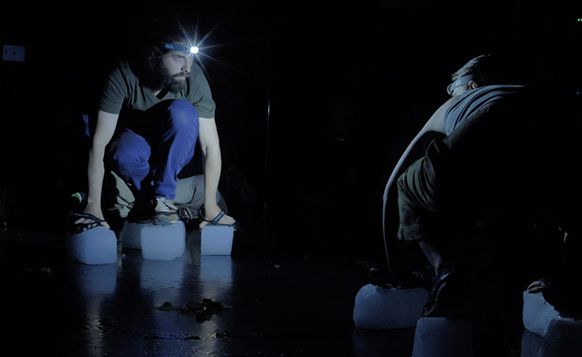 Enfin, les tableaux qui suivent offrent des variations interactives entre les corps des performeur·euses et les composantes des dispositifs, avec des branches feuillues, de la glace ou d’autres matérialités, en favorisant toujours l’exploration de cette agentivité mutuelle.