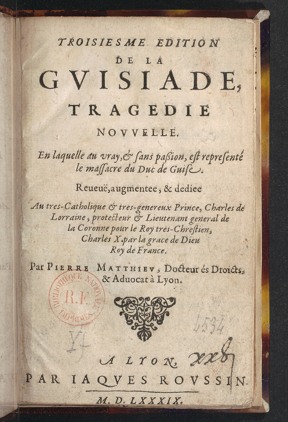 La tragédie intitulée La Guisiade de Pierre Matthieu a pour sujet l’assassinat d’Henri de Lorraine, duc de Guise, le 23 décembre 1588 à Blois au moment où la huitième guerre de Religion fait rage en France12Louis Lobbes (1997) fournit un compte rendu des circonstances ayant entouré l’exécution du duc de Guise et mentionne l’attitude ambiguë de la reine mère dans cette affaire. Quoique les renvois aux événements historiques et aux personnages contemporains qui informent la trame de La Guisiade soient affectés d’un net coefficient de référentialité, il ne s’agit pas dans cette étude de considérer la tragédie de Pierre Matthieu comme un document à l’aune duquel serait mesurée l’exactitude ou non de sa peinture avec la figure historique de Catherine de Médicis, mais d’en identifier plutôt les procédés rhétoriques mis au service d’une propagande ligueuse. Voir à ce propos Anne Teulade (2017).. Cette pièce a connu trois éditions l’année même de sa publication en 1589, à Lyon13Sur les variantes entre la première édition anonyme et la dernière version de La Guisiade, on consultera l’article de Gilles Ernst, « Des deux Guisiade de Pierre Matthieu » (1985). Notons que la première édition de La Guisiade a paru quelques mois après la mort de Catherine de Médicis. La troisième édition qui porte le nom de Pierre Matthieu a vraisemblablement été publiée après le décès d’Henri III survenu le 2 août 1589., ce qui témoigne de son succès. On connaît davantage Pierre Matthieu (1563-1621) comme historiographe officiel du roi Henri IV, poste qu’il occupe à partir de 1594 (Lobbes, 2005 : 495-519), que comme dramaturge ou, comme il l’écrit lui-même, « tragédiographe » (Matthieu, 2007 [1589] : 699), bien qu’il signe quatre autres tragédies et plus d’une centaine de poèmes. Il dédie notamment ses Odes chrestiennes (1588) à la reine Catherine de Médicis et compose des quatrains édités sous le titre Tablettes de la vie et de la mort (1605). Il aurait rédigé sa première pièce Clytemnestre (1578) alors qu’il n’avait qu’une quinzaine d’années. Il est aussi l’auteur de la pièce Esther, la plus longue tragédie du XVIe siècle que l’on ait conservée et qu’il fit jouer par ses élèves (Lobbes, 1990 : 9) au collège de Vercel dont son père était le principal. Il en remania le texte et en tira deux tragédies à clefs : Aman et Vasthi, publiées en 1589. Devenu avocat à Lyon en 1587, Pierre Matthieu était un ardent partisan de la Sainte Ligue, mais il se rallia à Henri IV et lui prêta serment d’allégeance en 159414Pour le détail des activités de juriste et de poète de Pierre Matthieu, on consultera l’article de Louis Lobbes, « Pierre Matthieu, dramaturge phénix (1563-1621) » (1998), ainsi que l’introduction de son édition de La Guisiade (1990 [1589])..