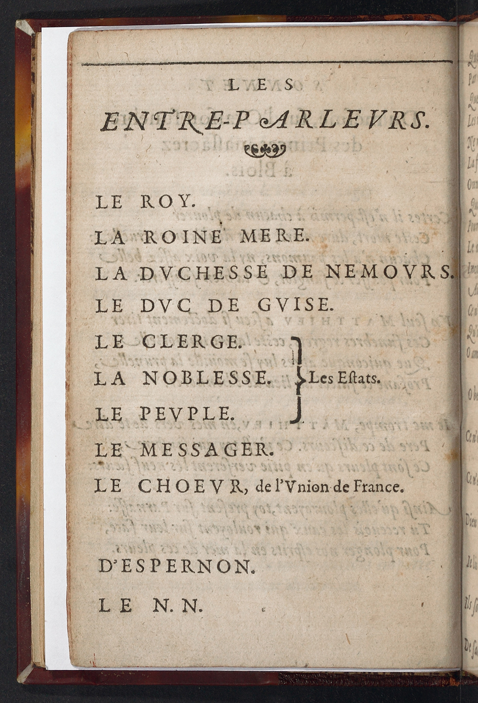 En effet, le dramaturge élabore, à travers les monologues des « entre-parleurs », une image claire et détaillée du roi Henri III, du duc d’Épernon et du duc de Guise, qui est le premier à prendre la parole. Leurs discours mettent l’accent sur des traits qui les distinguent. Ainsi, le duc de Guise se décrit le fer à la main :