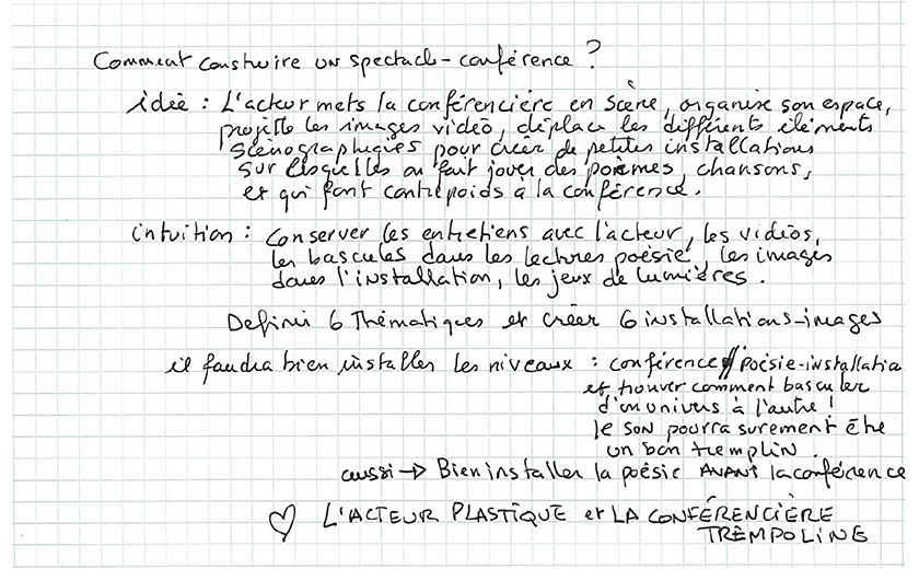 Nous avions déjà accumulé beaucoup de matériaux lors des premiers laboratoires, tant au niveau des contenus improvisés que des trouvailles esthétiques et formelles. Comme les répétitions de recherche étaient filmées, nous avons pu puiser à l’intérieur de cette banque pour entamer le processus de construction de la conférence.