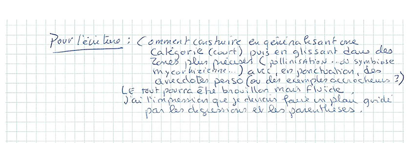 Étrangement, l’exactitude du contenu n’était pas compromise par cette façon d’entrer en contact avec ma mémoire. Les savoirs se sont le plus souvent avérés conformes à l’état de la recherche lorsque nous en avons validé et consolidé le contenu à une étape ultérieure. En fait, je suis certaine que j’aurais produit quelque chose de beaucoup plus pauvre si mes connaissances en écologie avaient été sollicitées de façon plus directe et volontaire.