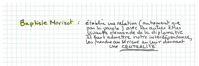 Une idée fixe s’est logée en moi, dès les premiers échanges auprès de Benoît et de Julie. Les écoutant discuter, voici la pensée tenace qui a frayé son chemin dans mes neurones : « La nature est intuable ».