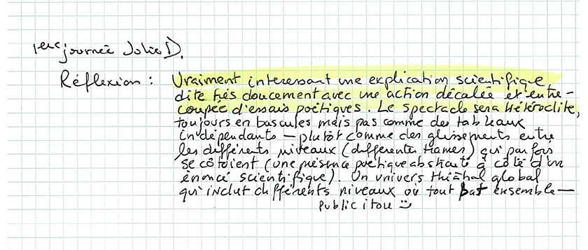 De là, revient à Benoît de traquer le sens et la poésie qui émanent, ou pas, de ce qu’on lui expose – souvent à notre insu. Il en transcrit des esquisses à la mine, les conserve précieusement. Le soir venu, il en tisse des trames qu’il nous partage le lendemain. Au cours des étapes de création subséquentes, Benoît nous demande de préciser nos impros à même cette étoffe se tramant avec nous, de plus en plus précise et détaillée. Ce système de travail correspond parfaitement, à mon sens, à la racine du mot « organisation », signifiant initialement « rendre apte à la vie » (Rey, 2006 : 2483).