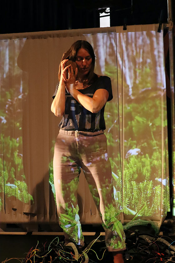 Nous projetions une image vidéo choisie au hasard à partir de la banque d’images représentant différents écosystèmes. L’acteur lisait l’un des extraits poétiques, le concepteur sonore proposait une ambiance et Julie, nourrie de ces stimuli, improvisait du contenu sur divers niveaux d’interdépendance. L’acteur, avec ses contraintes de mouvement et de jeu avec un objet, pouvait intervenir et amorcer un entretien avec Julie. Il pouvait également décider d’ouvrir la conversation au public (les personnes présentes en répétition). En plus du contenu théorique pour la conférence, ces improvisations laissaient émerger beaucoup d’images esthétiques, des dynamiques spatiales originales, des objets accrochés à l’écran ou le traversant, des jeux de manipulation entre les deux interprètes, des images projetées sur certains objets ou sur la conférencière…