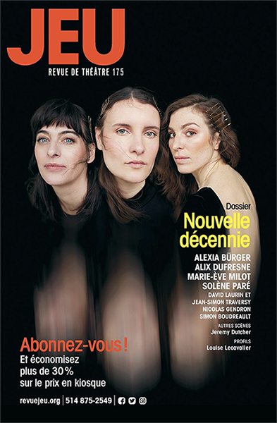 Le dossier « Nouvelle décennie » célèbre la venue des années 2020 en mettant en valeur plusieurs figures montantes des arts du spectacle vivant, auteur·trices, metteur·euses en scène, concepteur·trices. Un entretien avec Alexia Bürger, Alix Dufresne, Marie-Ève Milot et Solène Paré, quatre femmes qui renouvellent les pratiques de mise en scène, est suivi de rencontres avec la relève des directions artistiques de quelques théâtres. Les portraits de douze artistes émergent·es côtoient l’inventaire de compagnies de création en théâtre et en danse récemment établies. La deuxième portion du numéro s’intéresse aux initiatives visant à renouveler les publics, aux débouchés s’offrant aux finissant·es des études supérieures en théâtre de marionnettes, puis aux courants queer et néo-burlesque. Enfin, une prise de parole féministe de Marilyn Perreault et la mise en valeur de jeunes artistes autochtones, une entrevue avec Louise Lecavalier et un hommage à Andrée Lachapelle par Sylvie Drapeau complètent ce passionnant numéro.