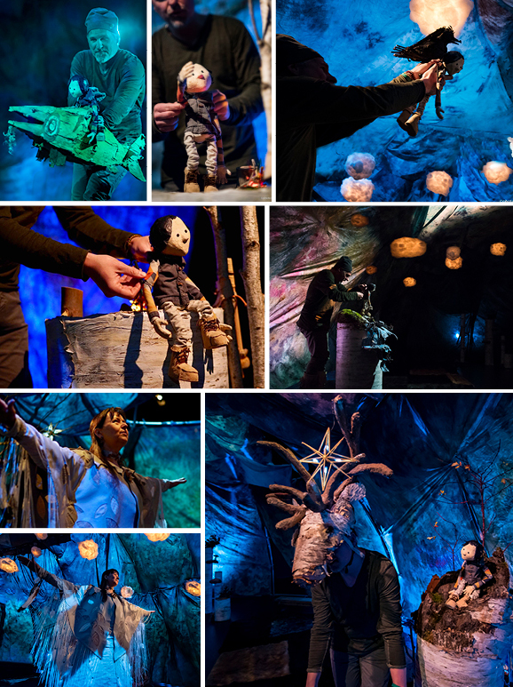 J. B. : J’ai eu le plaisir de voir Mokatek, spectacle d’Ondinnok pour jeune public écrit et joué par Dave Jenniss, directeur artistique d’Ondinnok depuis le départ d’Yves Sioui Durand et de Catherine Joncas. C’était à Ottawa en mai 2018. Pour le spectacle, tu as créé une tente pour les petit·es (deux à six ans) et leurs accompagnateurices, mais aussi une atmosphère intime et magique qui m’a replongée dans mon enfance…