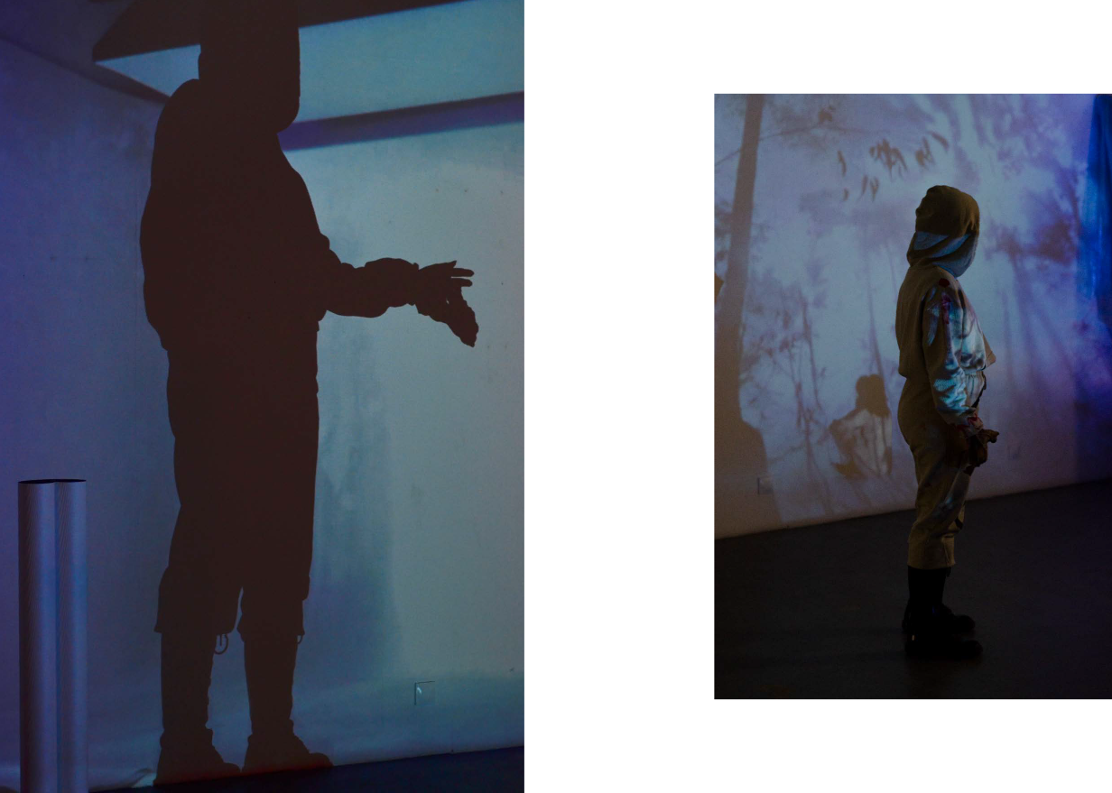 Ce deuxième acte est composé d’une performance sonore à partir du texte Philoctète de Cédric Demangeot (chant : Laura Kimpe; design sonore : Alexandre Galmard) et d’une installation visuelle (Angelina Battais). La scénographie de cet acte est faite de photographies et de vidéos de forêts (toutes les œuvres visuelles sont produites par Battais). Parmi ces œuvres, une projection vidéo gigantesque montre les quatre performers des quatre actes (Personnage de bois; Percée; l’Intendante du temps; Maître Fulgur) dans un studio photographique sur les murs duquel est projetée une forêt brumeuse (dans un jeu de mise en abyme confondant – voir fig. 9).
