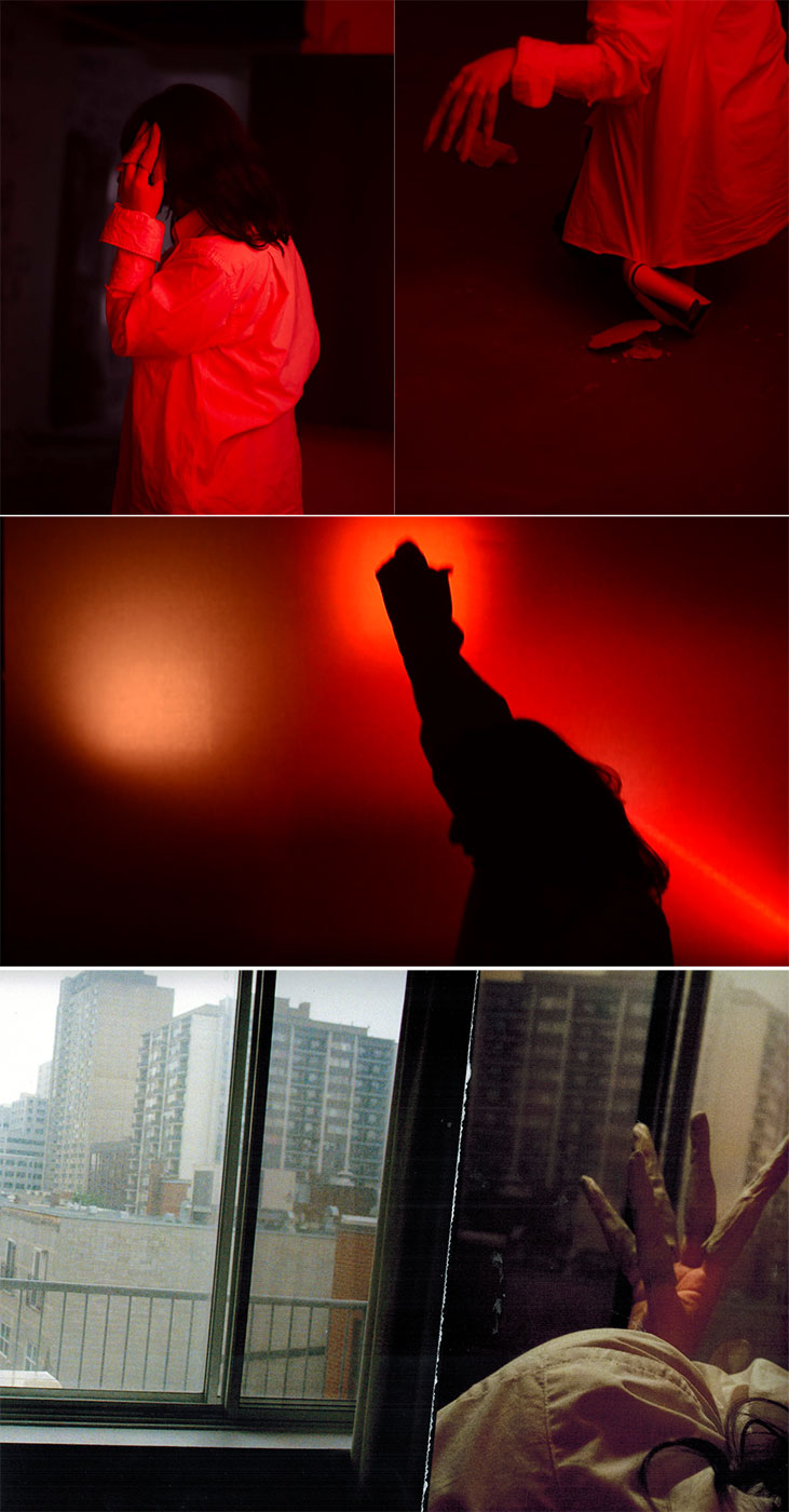 La scénographie est composée de deux grandes photographies montrant la vue d’une ville depuis une fenêtre (Battais) et d’un large panneau de lumières aux teintes rouges (sculpture lumineuse confectionnée par Battais et moi-même). Nous avons cherché à évoquer un intérieur casanier et calfeutré. Des plaques de glaise étaient disposées au sol et sur les murs. La performeuse y imprimait certains de ses gestes.