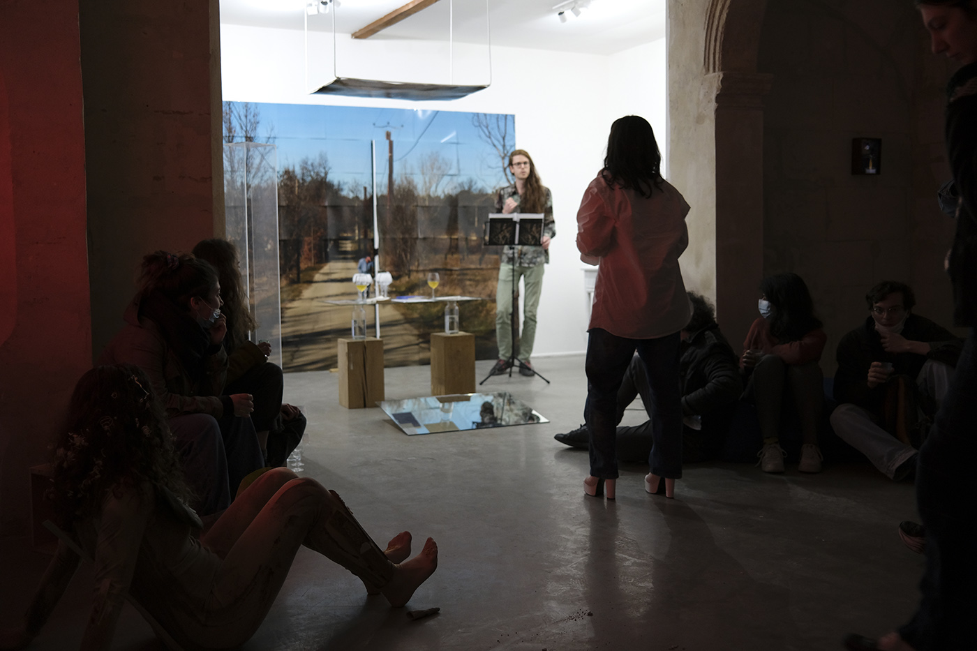 L’une des tentatives fortes de cette performance a été d’inscrire des pièces d’art à l’intérieur d’une trame dramatique. Nous avons pensé un drame où chaque élément de scénographie, de texte ou de son est une œuvre d’art à part entière. Ainsi, chaque objet présent dans l’espace de la performance – chaque photographie, chaque performer, chaque son – a une valeur artistique autonome et possède une fonction dans l’économie du drame. Des œuvres (photographies, sculptures, performances) ont été créées ou choisies en accord avec le drame et servent son expression. Réciproquement, le drame apporte une cohérence aux œuvres exposées dans la galerie, chacune étant impliquée dans la trame dramatique. Nous avons élaboré cette performance à la croisée de l’exposition d’art contemporain et du drame théâtral, à la manière d’une proposition muséologique : comment une forme dramatique peut-elle donner un sens à la combinaison des œuvres exposées dans une galerie d’art?