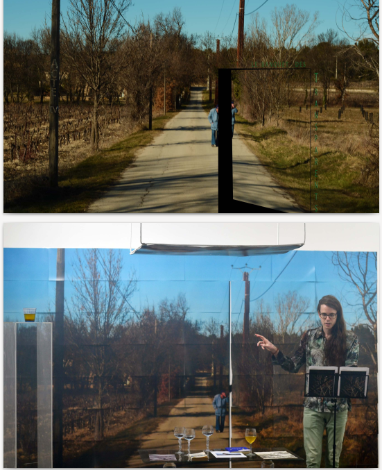 Une transition lumineuse franche ouvre le quatrième et dernier acte de la performance, « Le banquet des transparent-e-s ». Toutes les lumières de la galerie sont rallumées, le public découvre une salle qui conserve l’esthétique originale de la galerie : éclairage blanc cru, présentoir de prospectus, deux télévisions disposées dans un coin projetant des vidéos d’art. Le dernier acte débute par une adresse directe du conférencier au public : « eh ben bienvenue / bienvenu au banquet des transparen[t-e-s] ». Ainsi, le franchissement du quatrième mur et le changement net d’ambiance lumineuse entament la rupture du cadre théâtral et ouvrent à un jeu réflexif sur les limites de celui-ci.