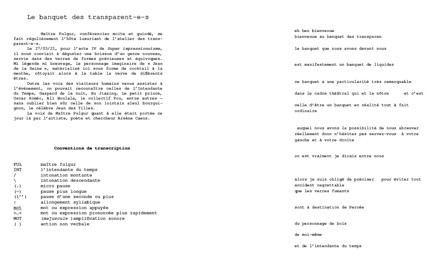 Maître Fulgur, un conférencier / poète, spécialiste des « transparent-e-s » (jeu de mots sur la transparence des liquides et sur celle des êtres de fiction), s’adresse aux trois personnages et au public. Il leur présente sa dernière concoction : une boisson à la menthe cueillie sur les rivages de la Seine (l’homophonie avec « scène » a son importance). Cet officiant du « banquet des transparent-e-s » invite les personnages et le public à se désaltérer (les personnages ayant des boissons fumantes, particulières à leur complexion). Il est auteur du texte qu’il prononce et concepteur du breuvage qu’il sert au public, invité à le déguster tout en découvrant sa composition et son histoire. Ce professeur / artiste de boisson, par son texte, transgresse les niveaux diégétiques : il est tour à tour un narrateur hétérodiégétique (il est extérieur à la diégèse, au monde de la fiction) ou un narrateur homodiégétique (il intègre la diégèse, le monde de la fiction).