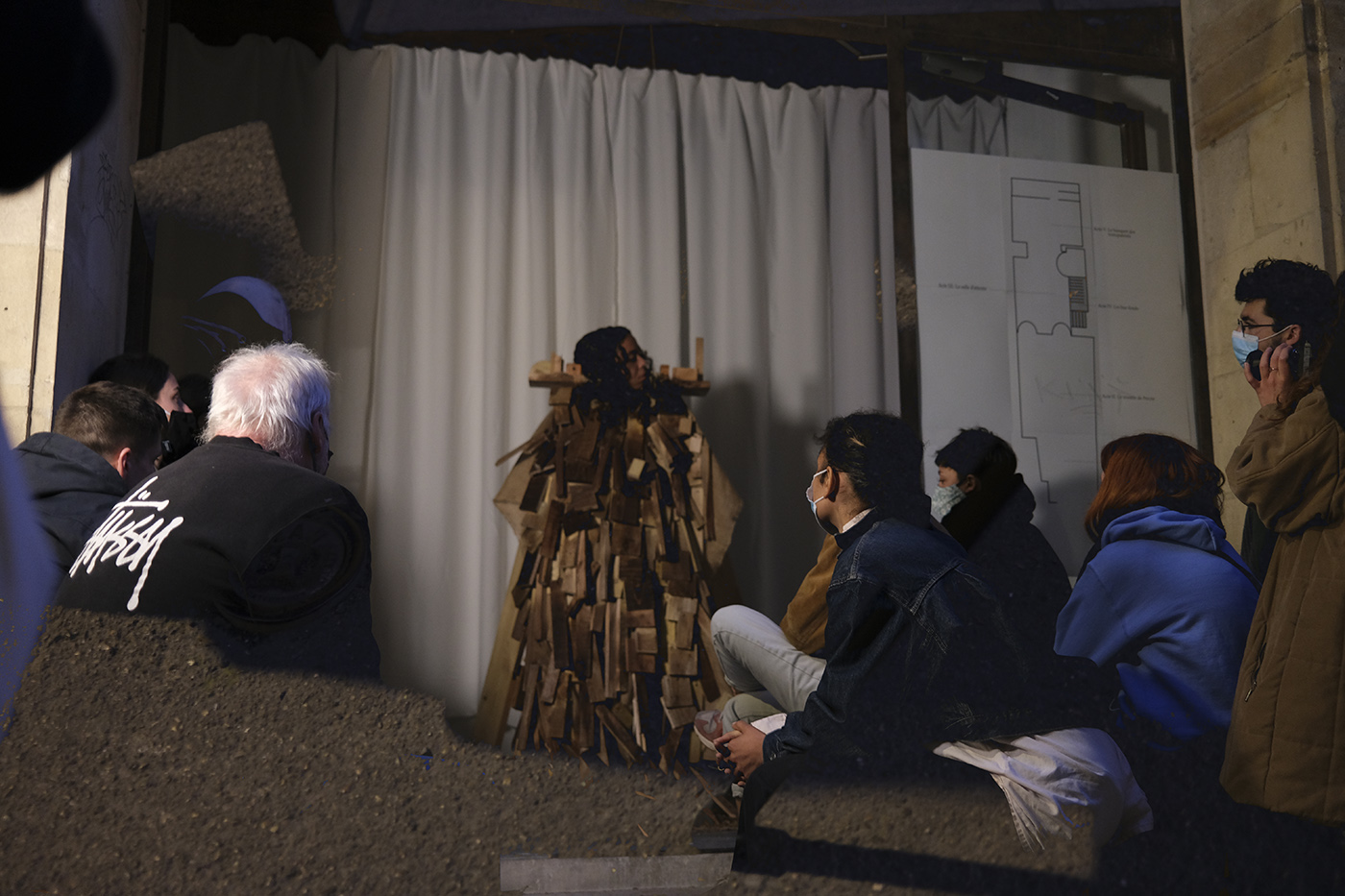 La performance débute à la tombée de la nuit. Le public est encore à l’extérieur de la galerie; depuis la rue, il découvre, en vitrine, une petite pièce aux murs blancs. En fond de scène, un pan de rideaux ondulants et rigides (ils ont été imbibés de colle et couverts de plâtre), eux-mêmes blancs. Au centre de cet espace blanchâtre et poudreux, une robe de bois massive encastre un individu. Le Personnage de bois (interprété par Bouzoumita), endormi dans l’opulent vêtement de bois, se réveille et observe les alentours. Plusieurs minutes s’écoulent, l’obscurité nocturne recouvre la sculpture de bois et son habitante coincée. Un projecteur, à l’éclairage chaud, illumine le personnage qui entame son monologue.