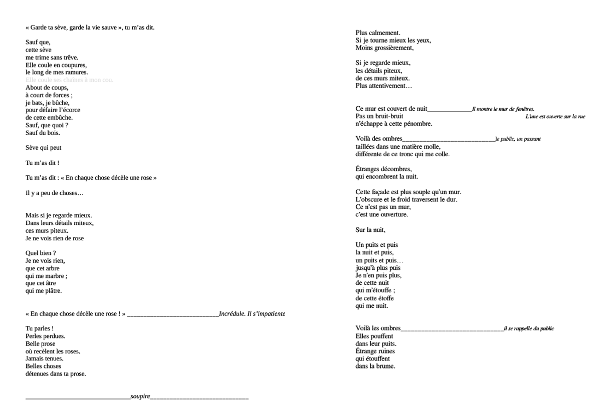 La déformation du cadre théâtral se concrétise d’abord par une détérioration du texte. Le deuxième acte comporte un chant dont la partition musicale a pour matériau de départ un fragment du poème Philoctète de Demangeot. Le texte est très partiellement audible en raison des transformations que nous lui avons appliquées. Toutefois, le texte original était affiché en grand sur l’un des murs de scène (à disposition du public) et la qualité de complainte (contenue dans Philoctète) était préservée et reprise dans le chant. Je rappelle le récit mythologique de Philoctète, repris dans le poème de Demangeot : aux suites de la guerre de Troie, Philoctète, blessé à la jambe, est abandonné sur une île, car la puanteur de sa plaie importune le bataillon grec. Seul sur l’île, enragé, l’infortuné déplore son exil et souffre sa blessure. Nous avons choisi de présenter un personnage, Percée, analogue féminin de Philoctète, qui parvient difficilement (à mots coupés) à formuler son malheur. Par exemple, la partition chantée soustrait certains phonèmes au texte original et en accentue d’autres ([r] grasseyé ou [r] non voisé) – le texte original et la partition sont présentés plus bas.