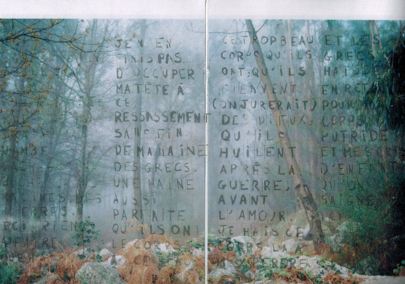 L’extrait du texte de Demangeot était placardé sur tout un pan de mur (voir fig. 11). Devant le texte, pendaient du plafond quatre longs bandeaux photographiques (d’une unique photographie divisée en quatre bandes – voir fig. 12). Nous cherchions à schématiser les troncs d’arbres d’une forêt dans les interstices desquels le texte transparaîtrait. Les documents qui suivent ne proposent pas une reproduction à l’identique de cette scénographie. Toutefois, vous trouverez une imitation du texte, dans la forme de son exposition (typographie inspirée du mouvement politique des colleuses : une lettre par feuille A4), ainsi qu’une reproduction de la photographie qui venait en avant du texte.